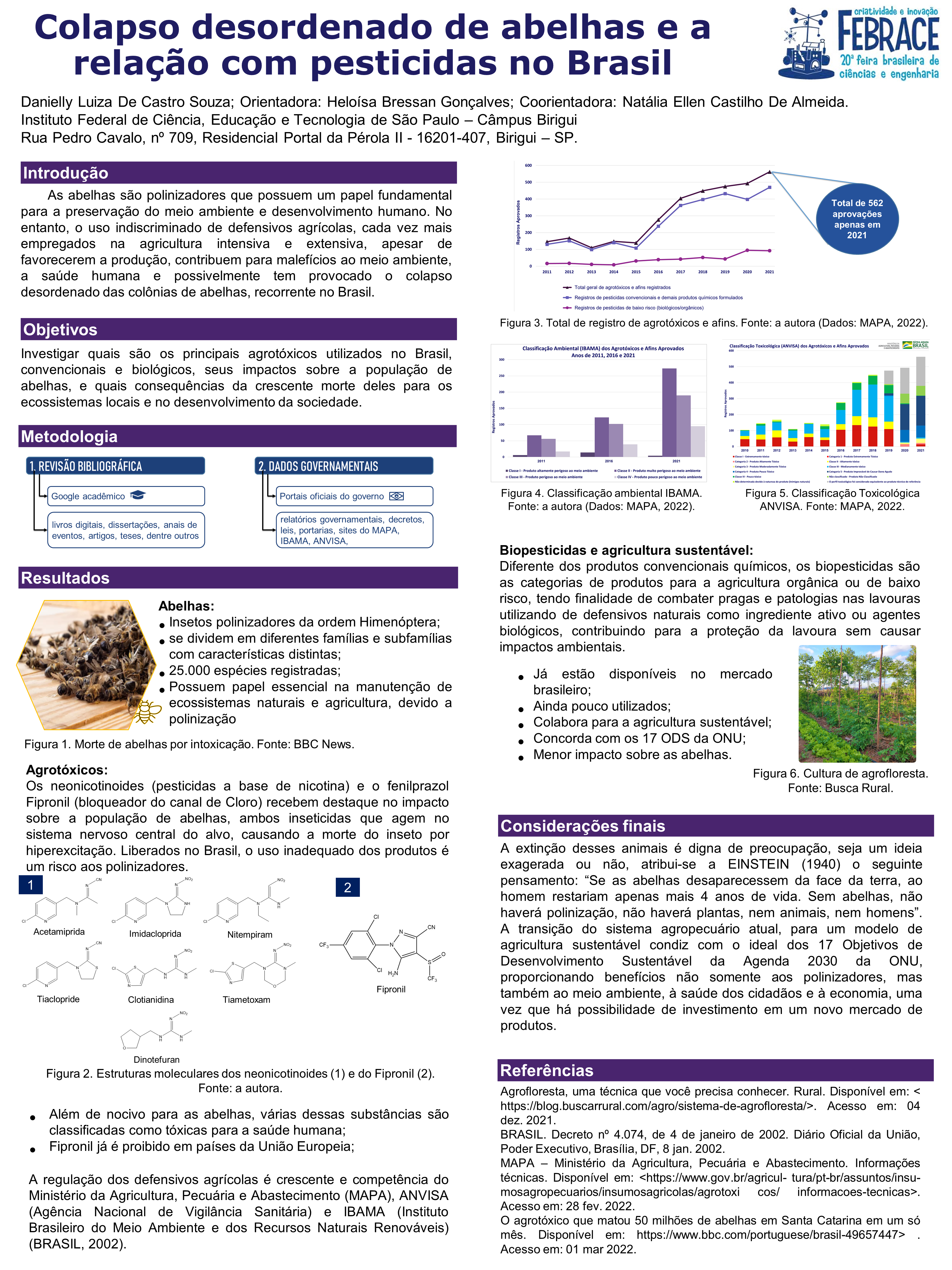 Os polinizadores, em especial as abelhas, possuem um papel fundamental para a preservação do meio ambiente e desenvolvimento humano. Esses animais proporcionam a troca de gametas entre flores favorecendo a frutificação de vegetais. No entanto, o uso indiscriminado de defensivos agrícolas, cada vez mais empregados na agricultura intensiva e extensiva, apesar de favorecerem a produção, contribuem para malefícios ao meio ambiente e à saúde humana. Esses produtos têm o objetivo de repelir ou eliminar agentes patogênicos, e incluem inseticidas, fungicidas, reguladores de crescimento, desfolhantes, dissecantes, dentre outros. O objetivo deste trabalho é analisar os agrotóxicos, principalmente os inseticidas implementados nas últimas décadas, relacionando a efetividade, capacidade de ação e toxicidade, além de analisar como estes agem sobre populações de abelhas. Para isso, serão analisados defensivos agrícolas com reconhecida ação negativa sobre as abelhas considerando-se as classificações toxicológicas e de periculosidade ambiental, o modo de utilização, a quantidade e concentrações em que são empregados. Os inseticidas neonicotinoides foram descritos como um dos defensivos agrícolas com maior responsabilidade no colapso desordenado das colônias de abelhas, no Brasil e no mundo causando a hiperexcitação neurológica destas. Sabe-se que desde 2000, defensivos biológicos de reduzida toxicidade têm sido empregados no Brasil. No entanto, a via é árdua, quando se comparam registros dos últimos 11 anos. No ano de 2020, o ano com maior registro de biopesticidas no Brasil, foram contabilizados 95 contra 226 do produto convencional. Espera-se com os resultados deste trabalho, complementar o conhecimento entre o uso agrotóxicos com o declínio de população de abelhas, atentando-se aos impactos a humanidade e ao meio ambiente, e buscar alternativas que estimulem o uso de biopesticidas para atingir “Fome Zero e Agricultura Sustentável”, diretrizes dos 17 ODS da Agenda 2030 da ONU.