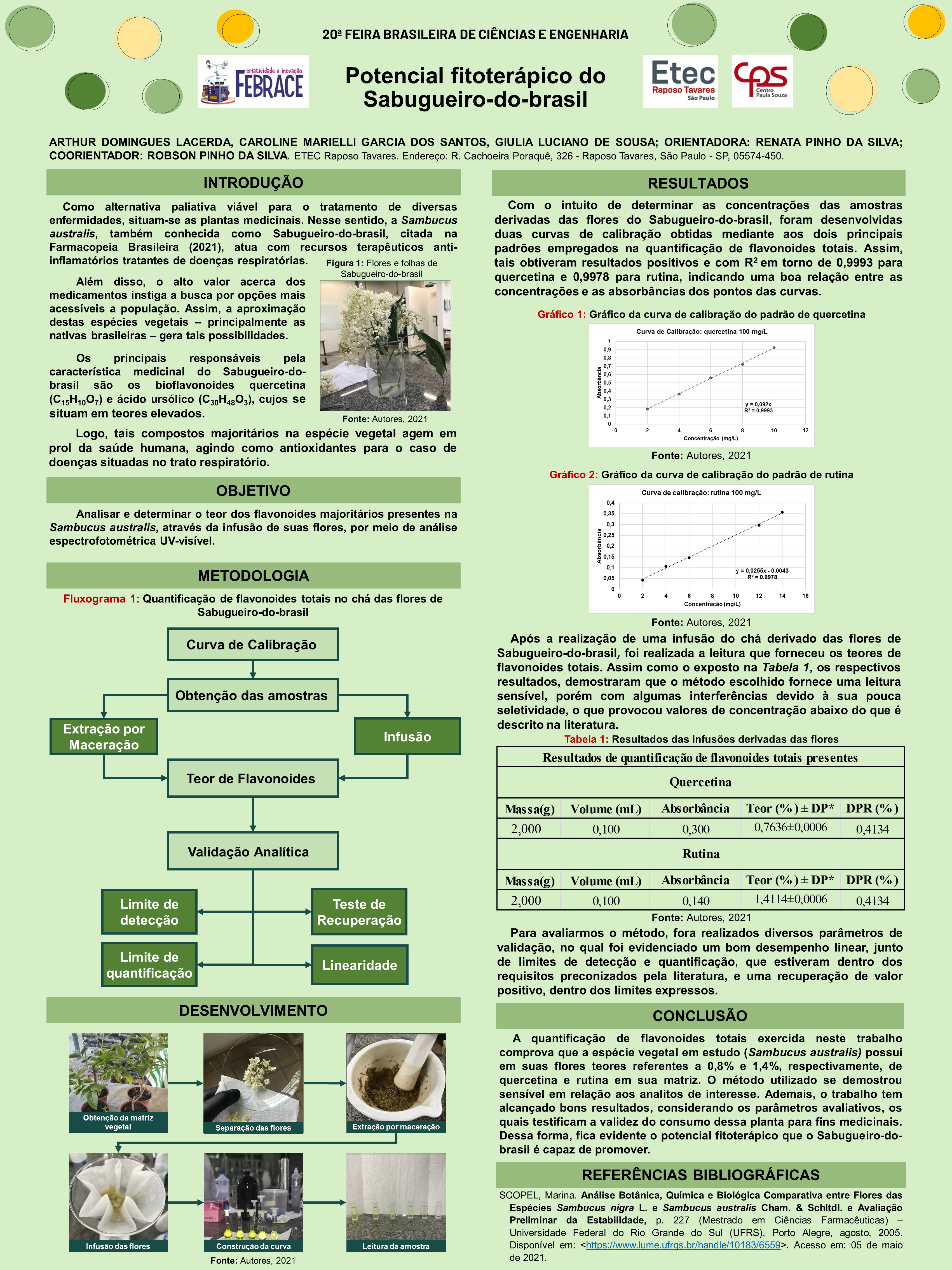 O alto valor acerca de medicamentos convencionais aplicados no tratamento de doenças do trato respiratório, como gripes e resfriados, causa a pertinência na descoberta de alternativas remediadoras palpáveis para a população. Dessa forma, na medicina popular, as plantas medicinais são providas de efeitos terapêuticos capazes de sanar inúmeras enfermidades. O sabugueiro-do-brasil (Sambucus australis Cham. & Schltdl.), constatado como um fitoterápico pela ANVISA (2021), é indicado como recurso terapêutico contra doenças respiratórias por conta de seus princípios ativos majoritários, que são bioflavonoides, atuantes por meio de suas propriedades antioxidantes e anti-inflamatórias. Assim, objetivou-se a quantificação do teor de flavonoides totais presentes no Sabugueiro-do-brasil, obtido na região norte de São Paulo. A análise do potencial antioxidante foi realizada por meio da quantificação do teor de quercetina e rutina, sendo preparadas as curvas analíticas a partir de seus respectivos padrões, seguindo o estudo feito por Marnucci e seus colaboradores (2020), a fim de comparar os respectivos valores que seriam encontrados na infusão do chá das flores a ser preparada. Efetuou-se duas extrações das flores do sabugueiro-do-brasil com dois distintos solventes. Ademais, foram estabelecidos parâmetros de linearidade, limite de detecção, limite de quantificação e teste de recuperação. O chá medicinal, complexado com cloreto de alumínio, foi analisado em espectrofotômetro UV-visível no comprimento onda entre 425 e 427 nm. Logo, encontrou-se nas frações teores favoráveis de flavonoides, sem grandes variações de concentração e dentro dos limites pré-estabelecidos por meio dos parâmetros de validação. Portanto, os resultados alcançados justificam a eficácia a respeito do consumo desta planta medicinal, a qual apresenta grande capacidade antioxidante demonstrada através do teor de seus flavonoides totais, sendo vantajosa a aproximação do uso desta espécie ao nosso cotidiano.