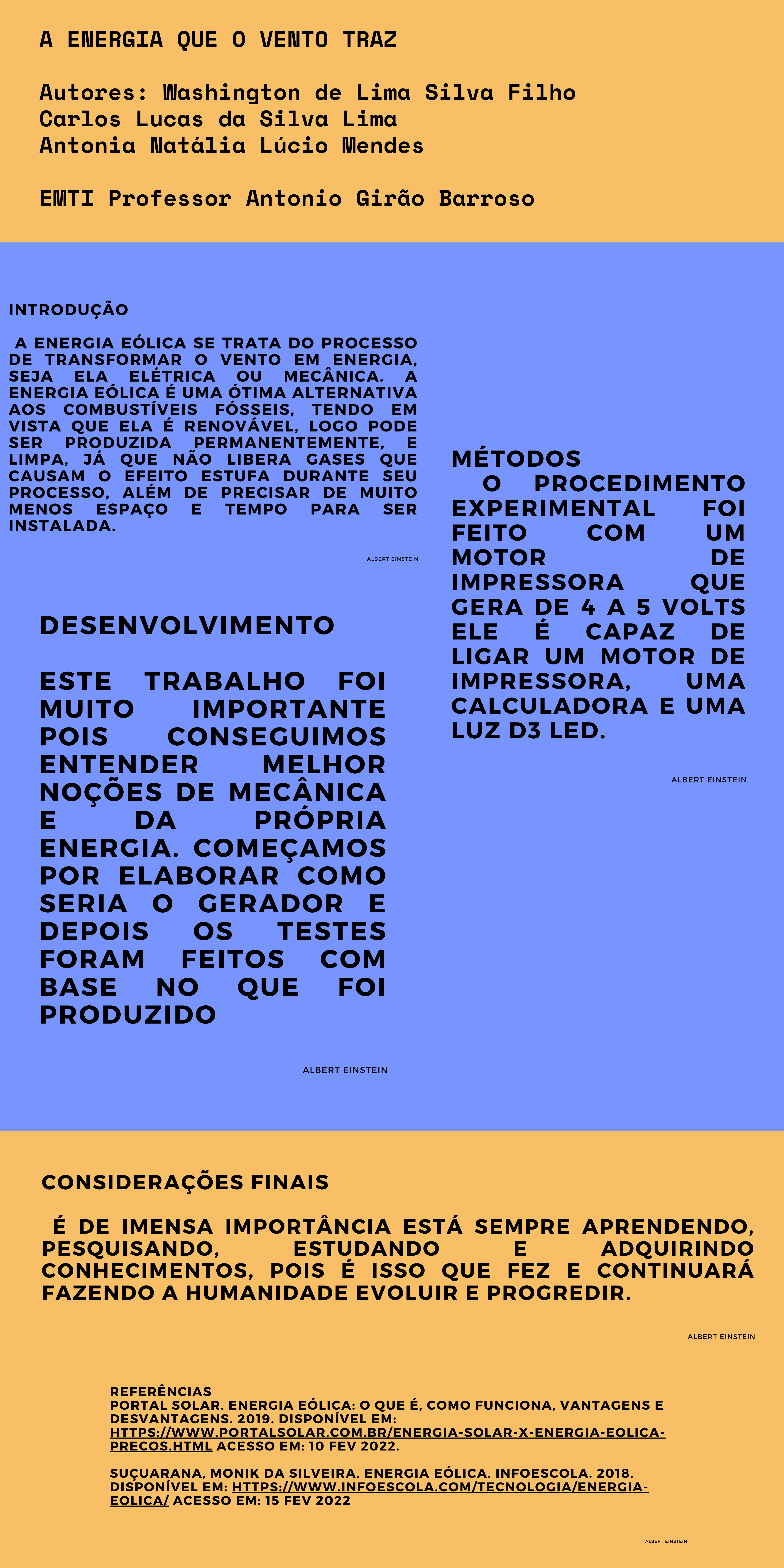 A energia eólica ainda é muito mal explorada, e com esse projeto gostaríamos de revelar o potencial energético que o Brasil tem através das usinas eólicas, com esse trabalho nós os alunos aprendemos a dar importância ao vento e saber que ele tem um potencial, e todos os alunos da escola Antônio Girão Barroso sabemos do poder energético que o Brasil tem e esperamos que um dia, que a energia eólica seja acessível a todo mundo.