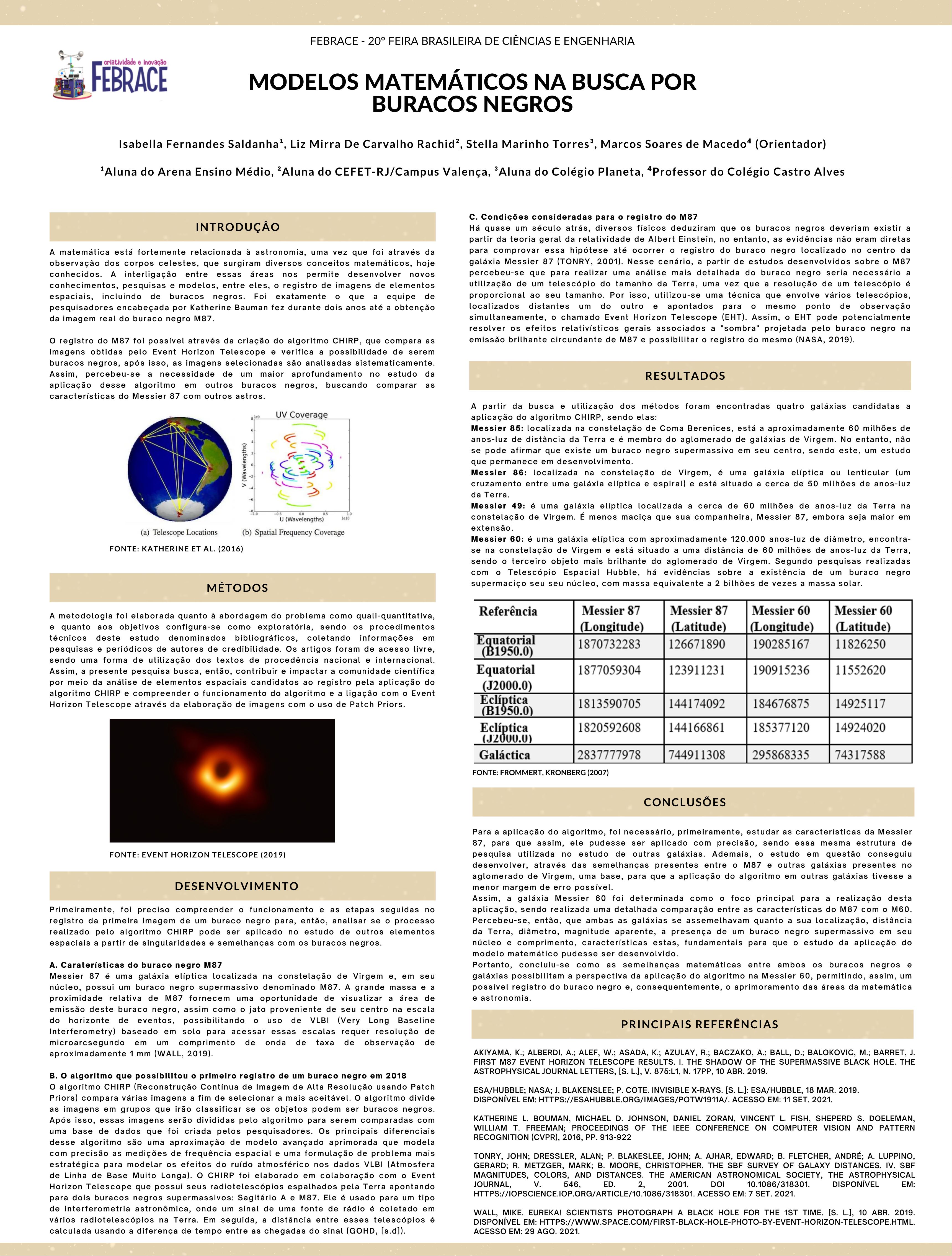 Os buracos negros são objetos de estudo da astronomia há vários séculos, no entanto, apesar da elaboração de diversas pesquisas acerca do tema, foi somente em 2018 que o desenvolvimento de um algoritmo criado pela cientista Katherine Bauman possibilitou a primeira imagem de um buraco negro, o Messier 87. Constata-se que o estudo desses astros é relativamente novo na ciência, sendo seu conhecimento e base teórica ainda muito limitada e incerta. Dessa forma, a presente pesquisa dedica-se ao estudo de galáxias e buracos negros que possuem semelhanças ao M87, visando a aplicação do algoritmo em outros elementos espaciais. A metodologia foi elaborada quanto à abordagem do problema como quali-quantitativa, e quanto aos objetivos configura-se como exploratória, sendo os procedimentos técnicos deste estudo denominados bibliográficos, coletando informações em pesquisas e periódicos de autores de credibilidade. Os artigos foram de acesso livre, sendo uma forma de utilização dos textos de procedência nacional e internacional. As análises desses materiais objetivam comparar as características dos elementos encontrados com o objeto de pesquisa, Messier 87. Através deste estudo, estabeleceu-se um plano de pesquisa buscando comparar as características do Messier 87 com outros astros e, então, encontrar possíveis candidatos para o Event Horizon Telescope. Assim, definiu-se como possível candidato, a galáxia Messier 60, que se aproxima da Messier 87 quanto às suas especificidades, características e singularidades como distância com da Terra, a presença de um buraco negro em seu núcleo, a classificação da galáxia e a magnitude aparente. Através dos resultados da pesquisa, espera-se poder encontrar novos candidatos em potencial para a aplicação do algoritmo CHIRP, assim como discutir se o avanço do estudo desses elementos espaciais viabiliza a descoberta das singularidades desses astros que regem as galáxias em que se encontram.