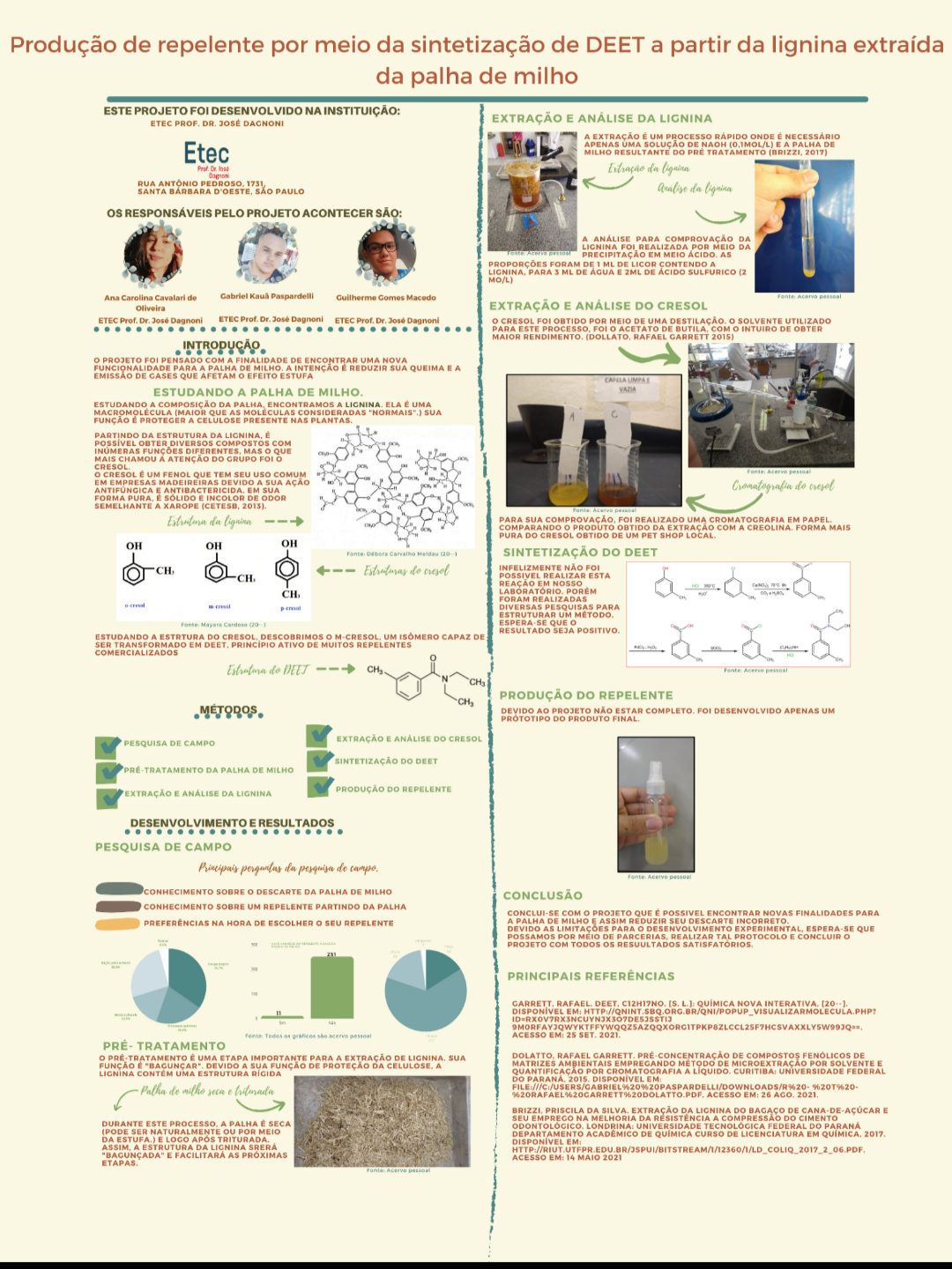 A palha de milho vem sendo um problema desde que surgiu junto de seu produto, o milho, seu fim é em grande parte a queima. Atualmente, muitos estudos são realizados para obter outras formas de utilizar o material, evitando que seu fim seja prejudicial para o meio ambiente. Analisando a composição desse material, foi notado a presença de um composto pouco estudado e com propriedades que permitem múltiplas utilidades, seu nome é lignina. A lignina compõe entre 10-30% das plantas e sua principal função é criar uma proteção para a celulose e a hemicelulose (CARVALHO, 2016). Observou-se que é possível obter outros compostos de maneira simples e que poderão resolver o problema envolto neste resíduo rural. Um dos compostos possíveis é denominado cresol, composto com capacidade de sintetizar outros produtos por meio de reações químicas, dentre eles está o N, N-dietil-m-toluamida, princípio ativo mais conhecido para repelentes. Visando determinadas épocas do ano em que índice de mosquitos aumenta, o presente trabalho demonstra por meio de procedimentos simples junto de uma reação de substituição nucleofílica de halogenação, a possibilidade de transformar algo que seria prejudicial para o meio ambiente em um dos produtos de maior necessidade para os seres humanos.