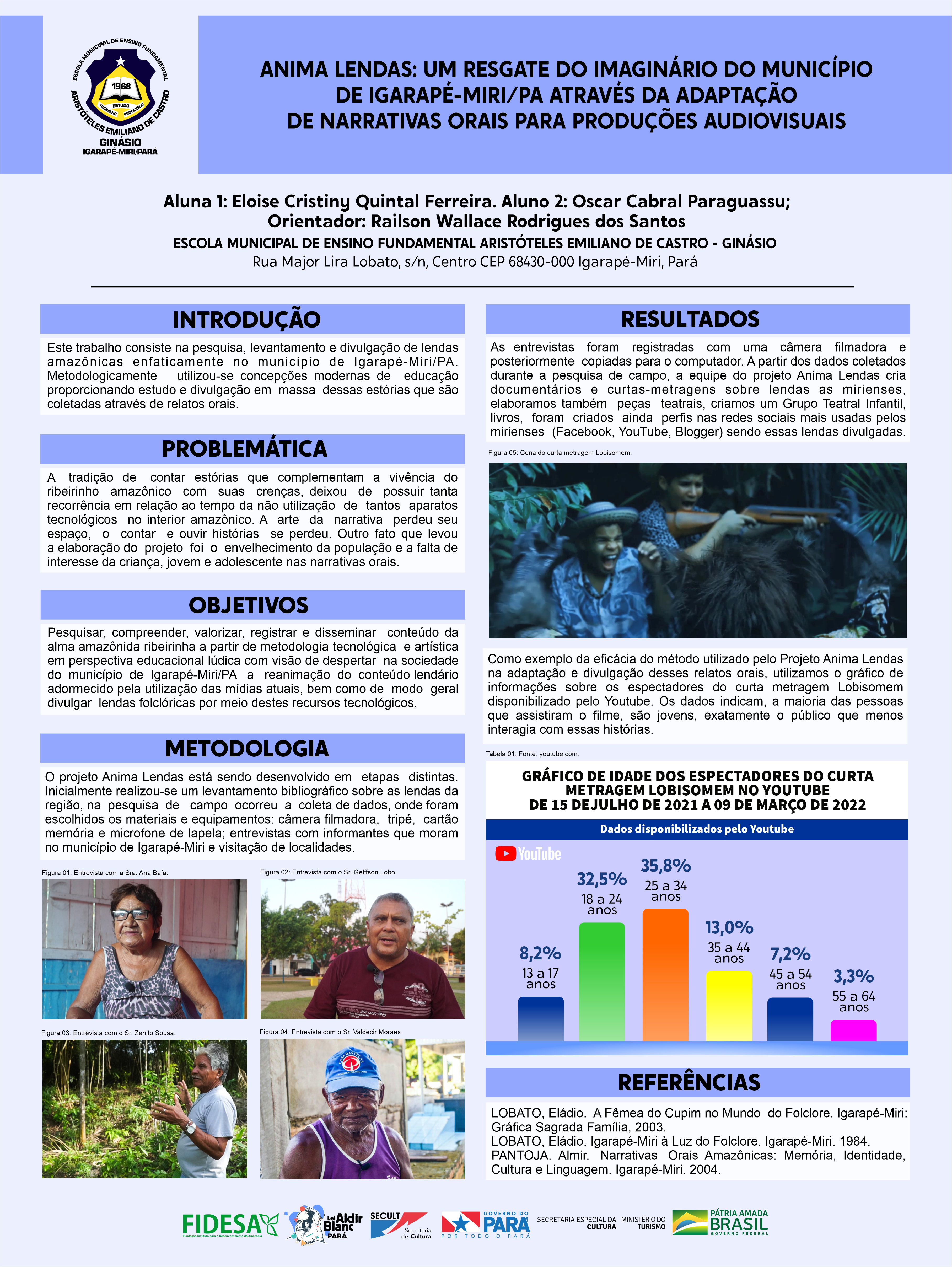 Esta pesquisa consiste no levantamento, registro e divulgação através de adaptações de lendas amazônicas com ênfase no município de Igarapé-Miri, localizado na região nordeste do Estado do Pará. Como método, utilizamos uma didática lúdica, através de concepções modernas de educação proporcionando a divulgação em massa desses relatos orais (como se é de costume nas culturas dos povos de origem ribeirinha), que são coletadas através de entrevistas. Em uma sociedade cada vez mais conectada, com modernos aparelhos tecnológicos lançados a todo momento, deve-se buscar novas maneiras de incentivar o interesse da população local nas lendas regionais, e criar novos métodos para o registro desse material, permitindo assim, que as futuras gerações possam ter acesso ao objeto da pesquisa. Aí está a importância do uso das redes sociais e da produção de material audiovisual, recursos tecnológicos que podem auxiliar na divulgação desses relatos orais, fazendo com que as lendas de Igarapé-Miri se tornem cada vez mais atraentes, principalmente para o público mais jovem. O projeto fundamenta-se em levantamento bibliográfico e coleta de depoimentos na modalidade oral das comunidades tradicionais no fortalecimento do discurso regional e fomento da disseminação desses conteúdos, há alguns esquecidos pela própria comunidade. Em resultados parciais o Anima Lendas percebeu o interesse pelas histórias e causos lendários da região através da produção audiovisual, e dos canais de comunicação do projeto, a saber, as redes sociais e demais recursos. Tal repercussão comprovou-se nos convites para exposição do projeto e seu resgate das lendas nos mais diversos eventos e ocasiões no município de Igarapé-Miri. A forma como o conteúdo do trabalho foi abordado, provocou olhares e chamou atenção, atingindo o objetivo principal deste projeto.