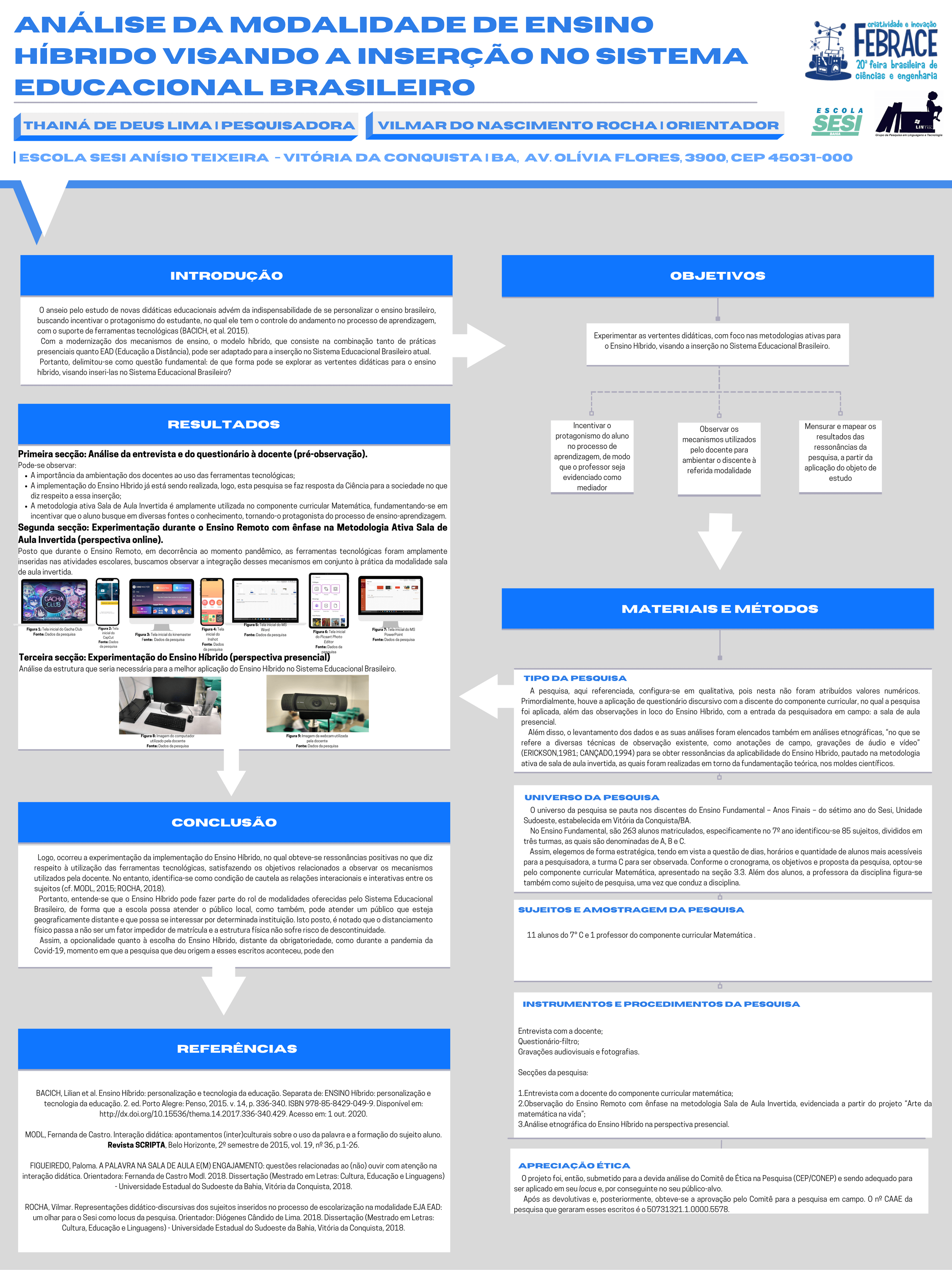 O estudo trata da investigação das modalidades de ensino híbrido, compreendendo a necessidade do sistema educacional brasileiro de acompanhar as transformações tecnológicas cotidianas ao seu público. O objetivo principal é explorar as vertentes didáticas do ensino híbrido. Os objetivos específicos são: incentivar o protagonismo do aluno no processo de aprendizagem, de modo que o professor seja evidenciado como mediador; observar mecanismos para ambientar o corpo docente à referida modalidade; mensurar e mapear os resultados da ressonância da pesquisa, a partir da aplicação do objeto de estudo. Justifica-se que o constante desenvolvimento tecnológico impacta na maneira de aprendizagem sendo, atualmente, instauradas como ferramentas de ensino, dinamizando a obtenção de conhecimento a partir do estudante, tornando-o assim o protagonista da sua aprendizagem, colocando a escola em uma posição de mediadora de informação, e não como total detentora da mesma. O estudo está pautado nos escritos de João Mouran (1999), que trata da aplicabilidade do ensino híbrido, e a relação com os professores e Lílian Bacich (2015), que exemplifica as diferentes modalidades do mesmo. A metodologia é quali-quantitativa, e possui seu locus de pesquisa na escola SESI Anísio Teixeira, onde serão feitas simulações com intuito de obter ressonâncias de como seria a aplicabilidade das diversas modalidades de ensino híbrido, e seus resultados. Por fim, espera-se encontrar a melhor forma de introduzir o modelo de ensino híbrido de maneira ativa no sistema educacional brasileiro.