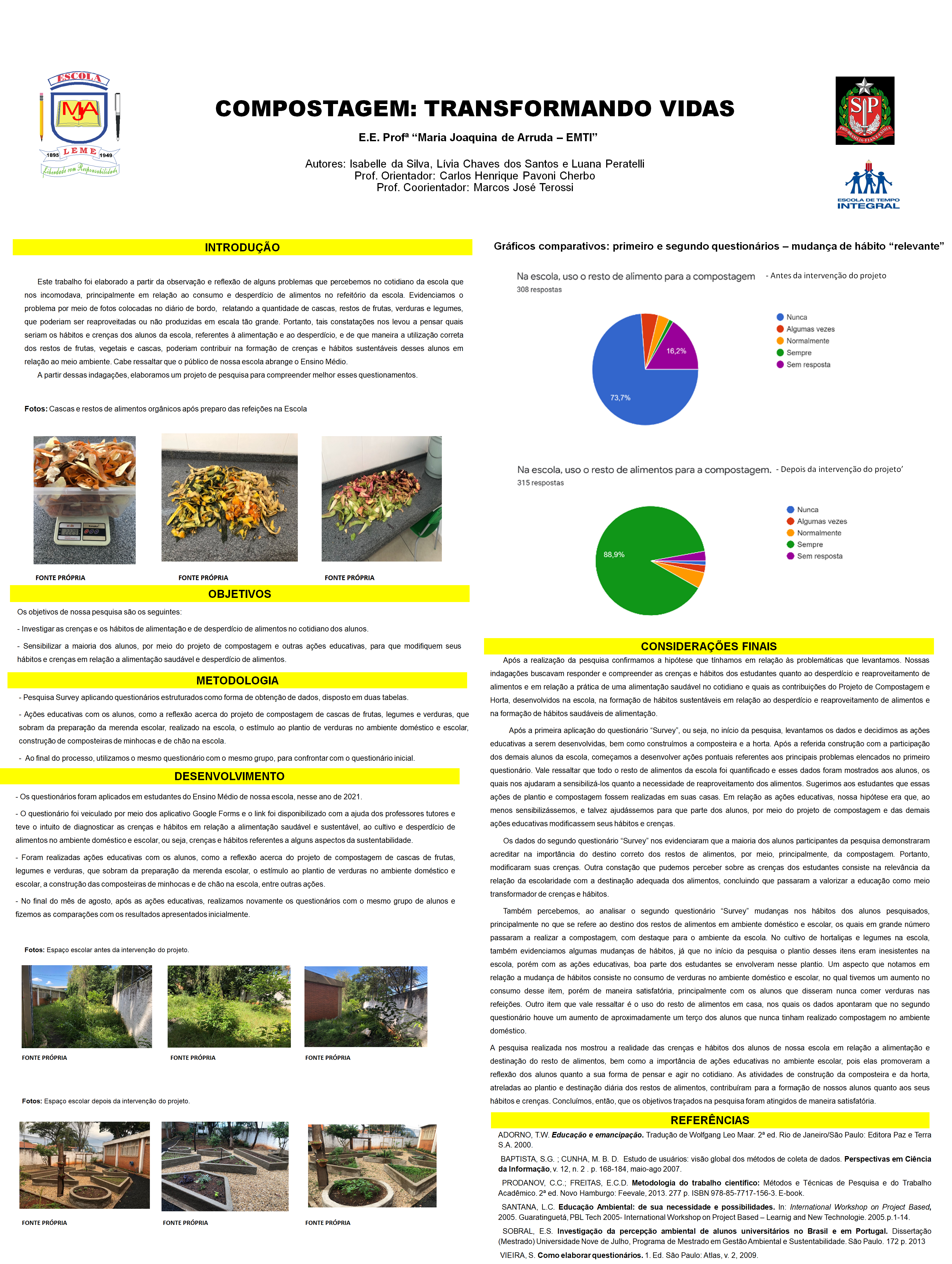 Este trabalho foi elaborado a partir da observação do desperdício e consumo de alimentos no refeitório da escola. O problema foi identificado por meio da observação e registrado através de fotos, relatando a quantidade de cascas, restos de frutas, verduras e legumes que poderiam ser reaproveitados. Foi decidido investigar as crenças e hábitos dos alunos em relação a essas questões. Para isso, foi utilizado o método “Survey” que consiste em um procedimento técnico de levantamento de dados que propõe a padronização para a interrogação direta de pessoas, onde podemos coletar dados para interpretações qualitativas e/ou quantitativas em diversas áreas de conhecimento. O público-alvo desta pesquisa foi de alunos do ensino médio de nossa escola. Primeiramente foi aplicado o primeiro questionário “Survey” que nos forneceu dados para a elaboração de ações educativas, como a compostagem e o plantio de verduras, que foram trabalhadas com os alunos durante determinado período. Posteriormente foi aplicado o segundo questionário “Survey”, para confrontar os dados com o do primeiro. Pôde-se observar que houve mudanças nas crenças e nos hábitos dos alunos de nossa escola em relação a alimentação e destinação do resto de alimentos e percebeu-se a importância de ações educativas no ambiente escolar, pois elas promovem a reflexão dos alunos quanto a sua forma de pensar e agir no cotidiano. As atividades de construção da composteira e da horta, atreladas ao plantio e destinação diária dos restos de alimentos, contribuíram para a formação de nossos alunos quanto aos seus hábitos e crenças. Dessa forma, concluímos, então, que os objetivos traçados na pesquisa foram atingidos de maneira satisfatória.