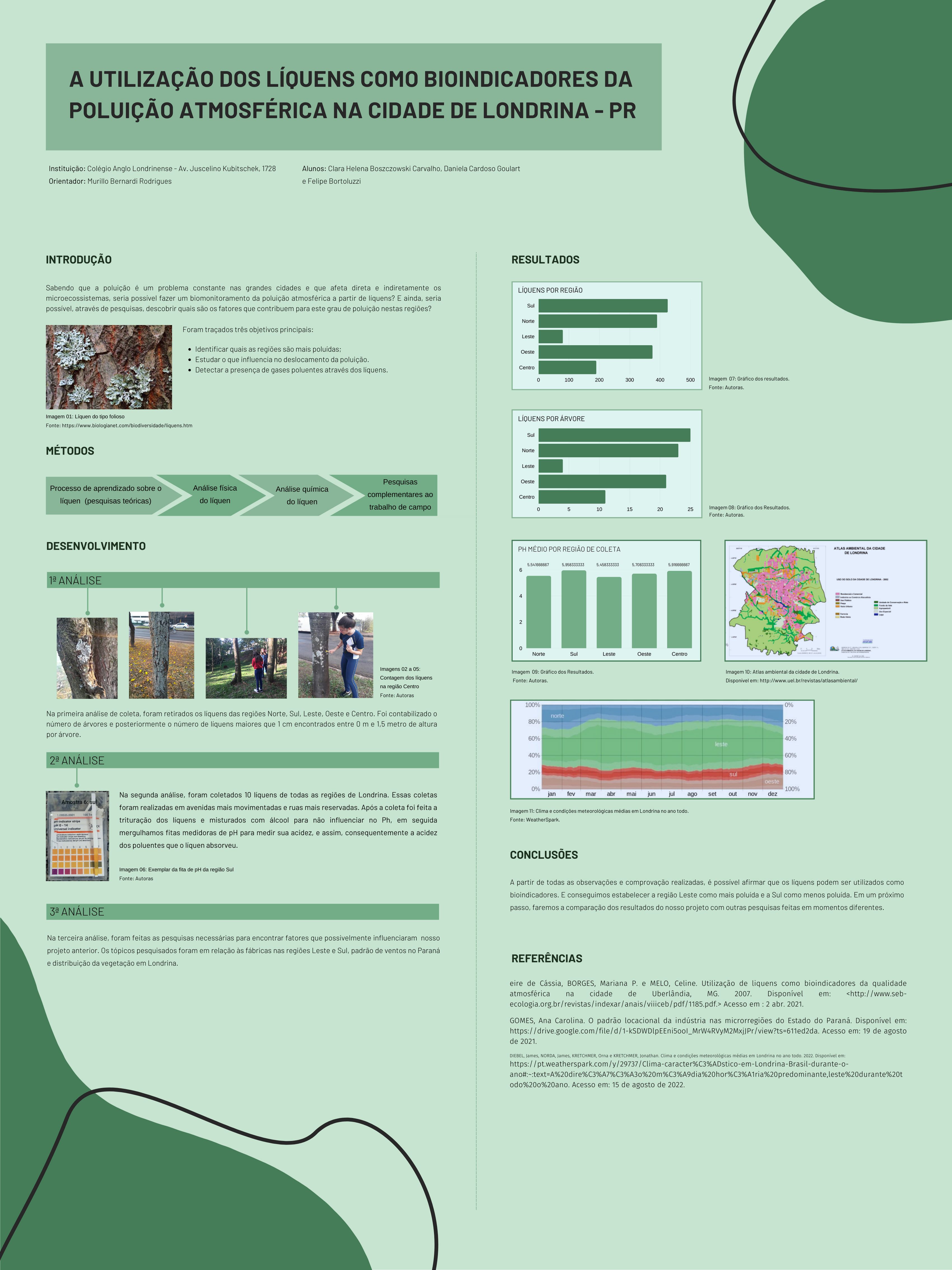 Os líquens são associações de fungos com algas que, por sua sensibilidade a mudanças atmosféricas como a poluição, podem servir como biomonitores de qualidade do ambiente. Partindo dessa ideia, o projeto teve como objetivo identificar as áreas com maior índice de poluição por meio dos líquens e detectar as principais causas de poluição da cidade de Londrina-PR através dos níveis de acidez de cada região. Na primeira etapa foi demarcado um quadrante de 10 metros quadrados, utilizando apenas um barbante, no vale Água Fresca, localizado na região central de Londrina-PR. Dentro dessa área foi contabilizado o número de árvores e, posteriormente, o número de líquens maiores que 1 cm encontrados entre 0 metro e 1,5 metro de altura por árvore. A coleta de dados nas regiões norte, sul, leste e oeste segue a mesma metodologia usada na região central, mas quando não foi possível a marcação do quadrante, foi feita a contagem da mesma quantidade de árvores encontradas na análise inicial. Uma segunda etapa foi realizada em que foram coletados 10 líquens por região e levados ao laboratório do Colégio Londrinense. As amostras foram dissolvidas em água destilada e depois medidas com uma fita medidora de pH. Ambos os experimentos apresentaram a região sul de Londrina como a menos poluída e a região leste como a mais poluída. Em seguida, o grupo levantou questionamentos sobre o resultado obtido e foram realizados levantamentos bibliográficos para sua interpretação. Com isso, pôde-se concluir que os ventos de Londrina e região sopram em direção leste durante o ano todo, sendo um fenômeno que ocorre há anos na área do norte do Paraná, segundo o site meteorológico internacional WeatherSpark. Descobriu-se também que a parte sul de Londrina abriga grande porção das regiões de reserva e matas ciliares da cidade. Com o respectivo projeto, pode-se afirmar que o líquen é um bioindicador eficaz, pois apresenta com exatidão os resultados comprovados pelas pesquisas teóricas.