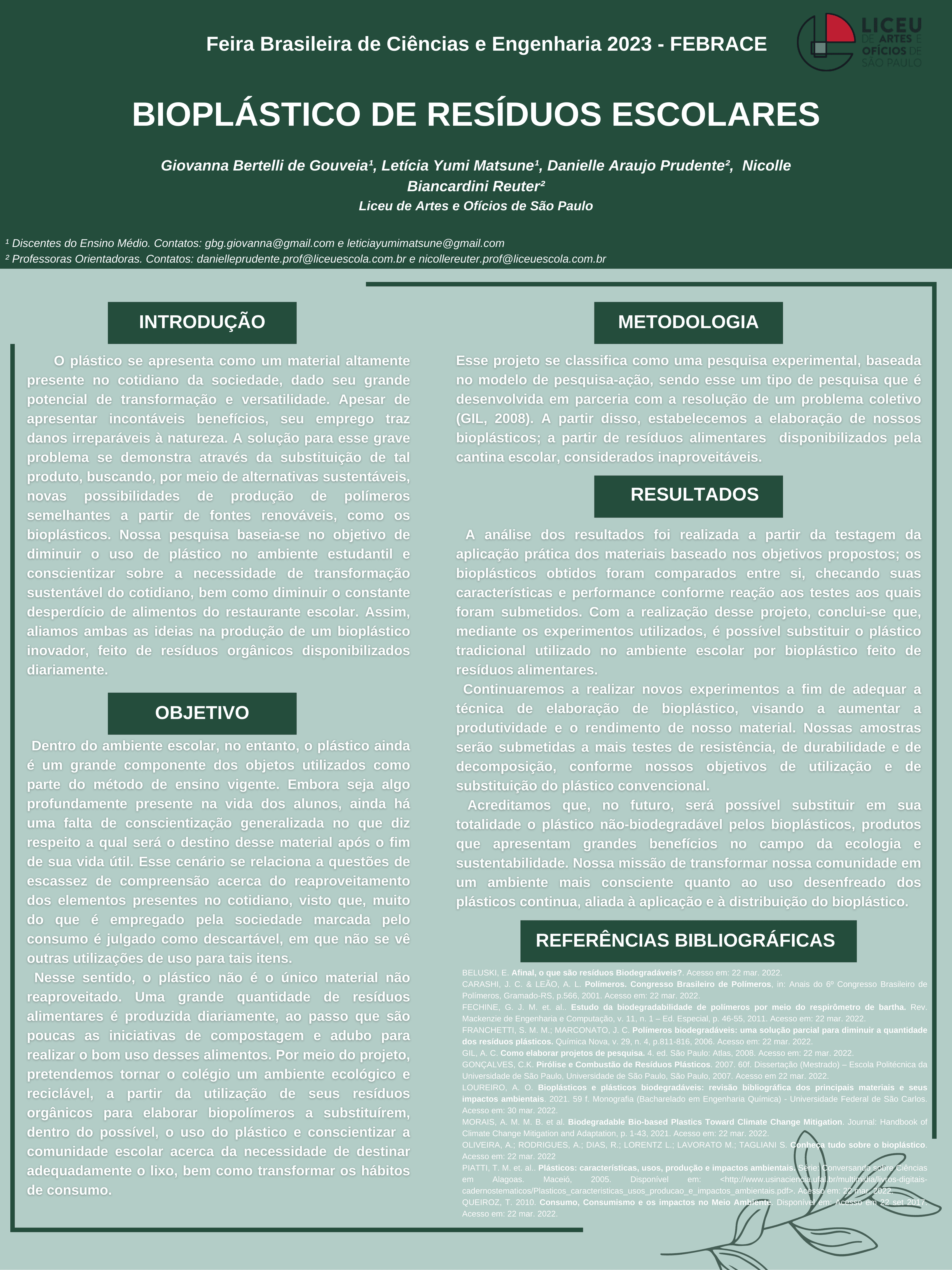 O plástico se apresenta como um material altamente presente no cotidiano da sociedade, dado seu grande potencial de transformação e versatilidade. Apesar de apresentar incontáveis benefícios, seu emprego traz danos irreparáveis à natureza. A solução para esse grave problema se demonstra através da substituição de tal produto, buscando, por meio de alternativas sustentáveis, novas possibilidades de produção de polímeros semelhantes a partir de fontes renováveis, como os bioplásticos. Nossa pesquisa baseia-se no objetivo de diminuir o uso de plástico no ambiente estudantil e conscientizar sobre a necessidade de transformação sustentável do cotidiano, bem como diminuir o constante desperdício de alimentos do restaurante escolar. Assim, aliamos ambas as ideias na produção de um bioplástico inovador, feito de resíduos orgânicos disponibilizados diariamente. Como resultado, obtivemos amostras com características variadas, que podem ser implementadas em diversos contextos, desde copos até plástico filme. Continuaremos a aperfeiçoar nosso produto para ampliarmos ainda mais suas possibilidades.