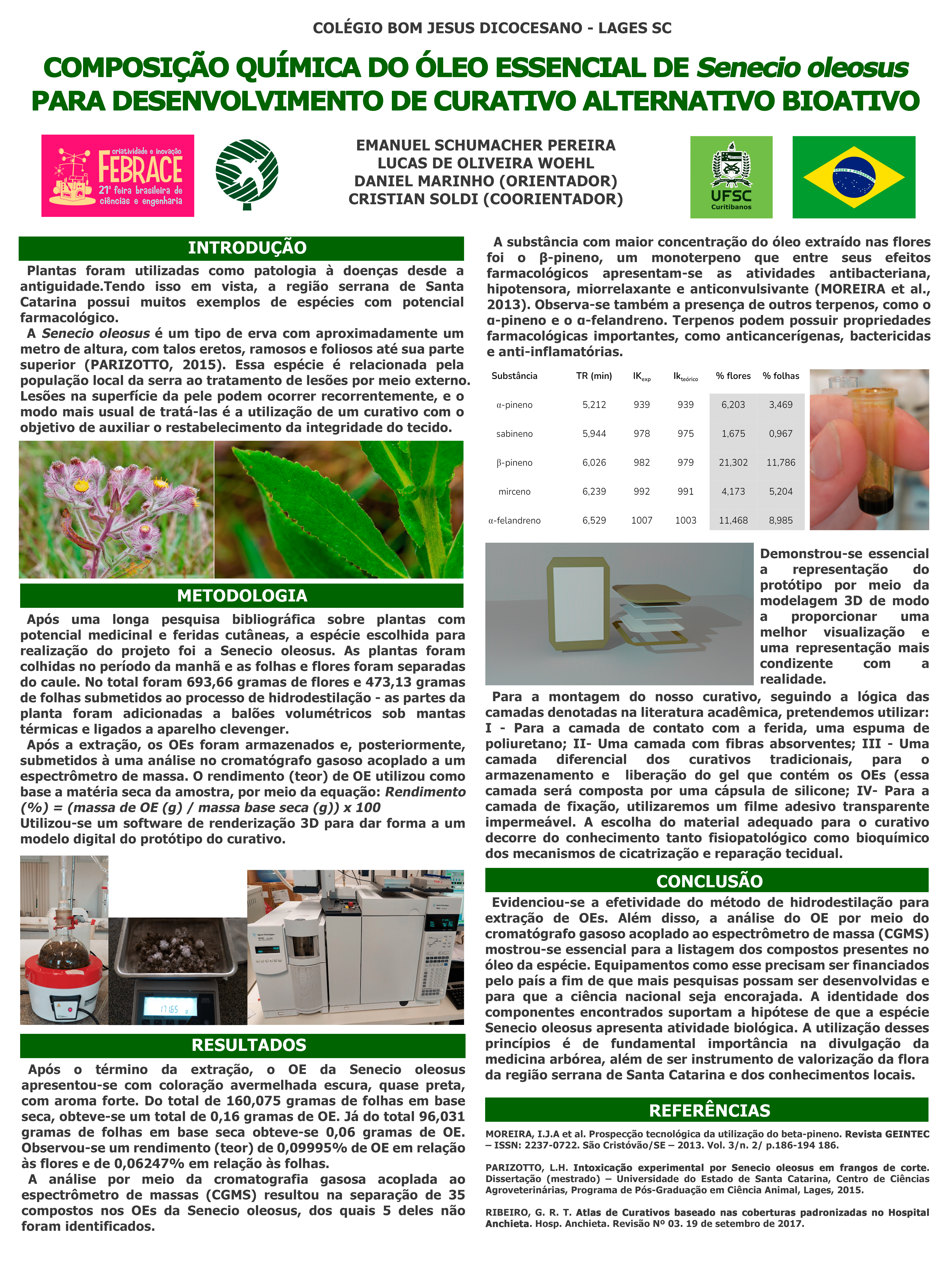 Espécies vegetais foram utilizadas como fonte de tratamento patológico desde tempos remotos. A região serrana de Santa Catarina contém muitos exemplos de espécies com tal potencial. A Senecio oleosus (arnica da serra) é uma erva relacionada à população local como possuindo poderes curativos por meio de uso externo. Este trabalho objetivou a caracterização dos componentes químicos do óleo desta espécie para utilização de tais capacidades na composição de um curativo bioativo. Coletaram-se tais plantas e separaram-se flores e folhas para submissão dessas partes vegetais a hidrodestilação por arraste a vapor para retirada de seu óleo essencial. O óleo essencial foi submetido a uma análise de cromatografia gasosa acoplada a espectrômetro de massa (CGMS). Foram observados 35 compostos no óleo da espécie como o α-pineno, β-pineno, sabineno, mirceno, α-felandreno e o limoneno, além de outros componentes como ocimeno e outros terpenos, que possibilitam a hipótese da Senecio oleosus apresentar atividade fitoterápica válida. Dos compostos observados, cinco não foram identificados.