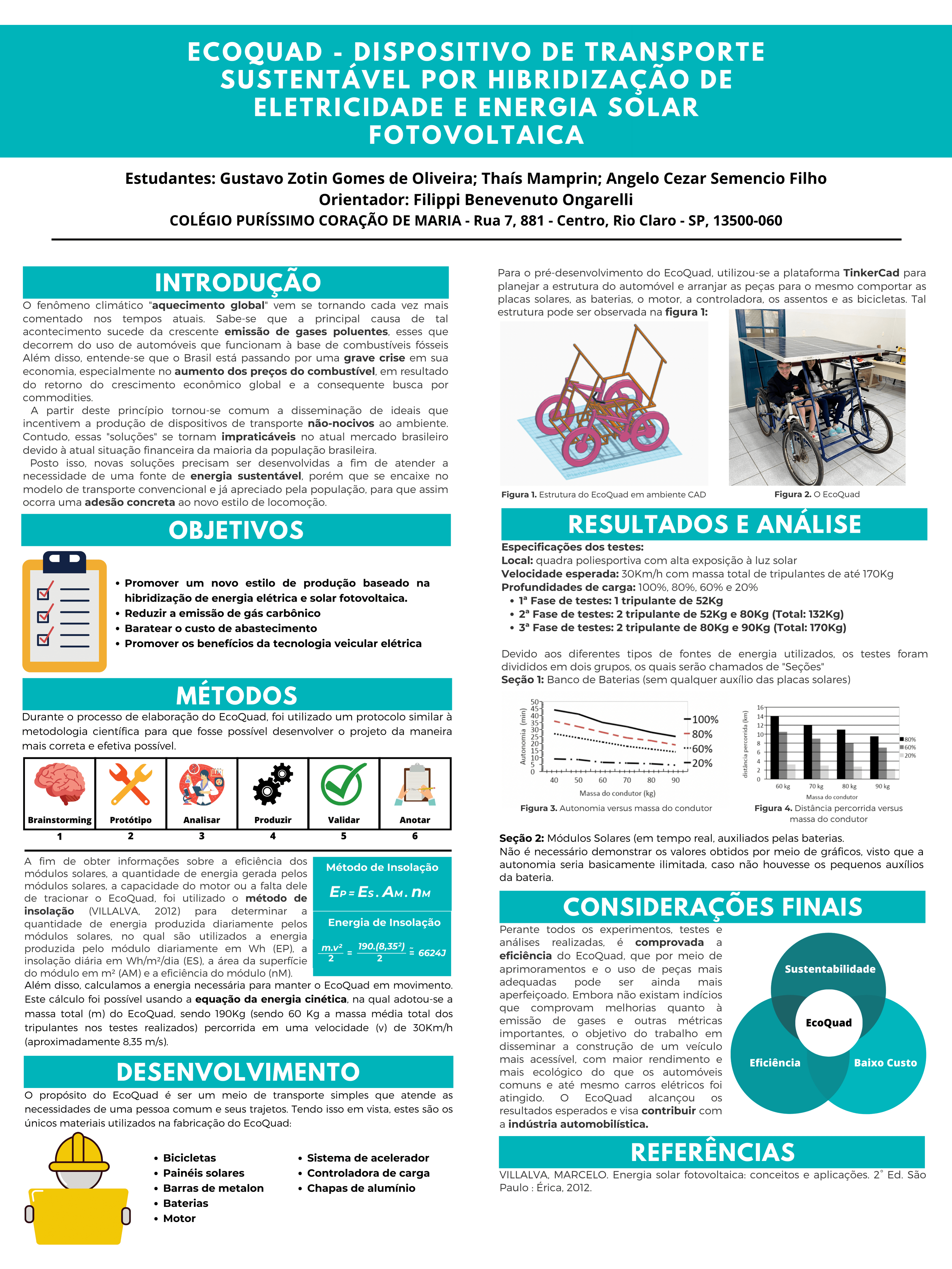 Durante as últimas décadas, o aquecimento global vem sendo amplamente comentado ao redor do mundo. Junto ao fenômeno em si, é também discutido o fato de uma de suas principais causas ser a emissão de gases poluentes na atmosfera, que por sua vez são produzidos por carros e outros meios de transporte. Acerca da situação, tem se tornado comum a disseminação de questões ambientais a serem exploradas e a tendência de grandes empresas automobilísticas darem início à produção de veículos que não utilizam combustíveis fósseis, além de procurarem soluções também relacionadas ao formato desses veículos. Contudo, tais soluções apresentam diversas falhas, isso porque são raramente acessíveis à população, além de utilizarem diferentes fontes de energia que não deixam de serem nocivas ao ambiente. Outro entrave que pode ser notado é o desinteresse da população quanto a outros tipos de veículos que não sejam comuns ou convenientes e que requerem certa adaptabilidade. Novas soluções devem ser criadas de modo que sejam atendidos aspectos econômicos, sociais e ecológicos. Dessa forma, é apresentado o desenvolvimento e a execução de um automóvel pessoal chamado de EcoQuad, cujo propósito tem caráter educativo e político, buscando, assim, promover um novo estilo de produção baseado na hibridização de energia elétrica e solar fotovoltaica. Como caráter científico, o desenvolvimento deste projeto visa comprovar os aspectos ecológicos e eficientes que podem ser atingidos em conjunto através do sistema híbrido de energia descrito. Por ser um veículo híbrido, movido a baterias e placas solares que trabalham em conjunto, o custo-benefício é superior a veículos comuns, pois, com a correta distribuição de energia utilizada do banco de baterias e dos módulos solares, a manutenção do veículo será mais acessível e menos frequente. Para que tal experimento seja possível de ser executado, conclui-se a necessidade de ampliar a nacionalização tecnológica, o que tornaria o projeto comercialmente viável.