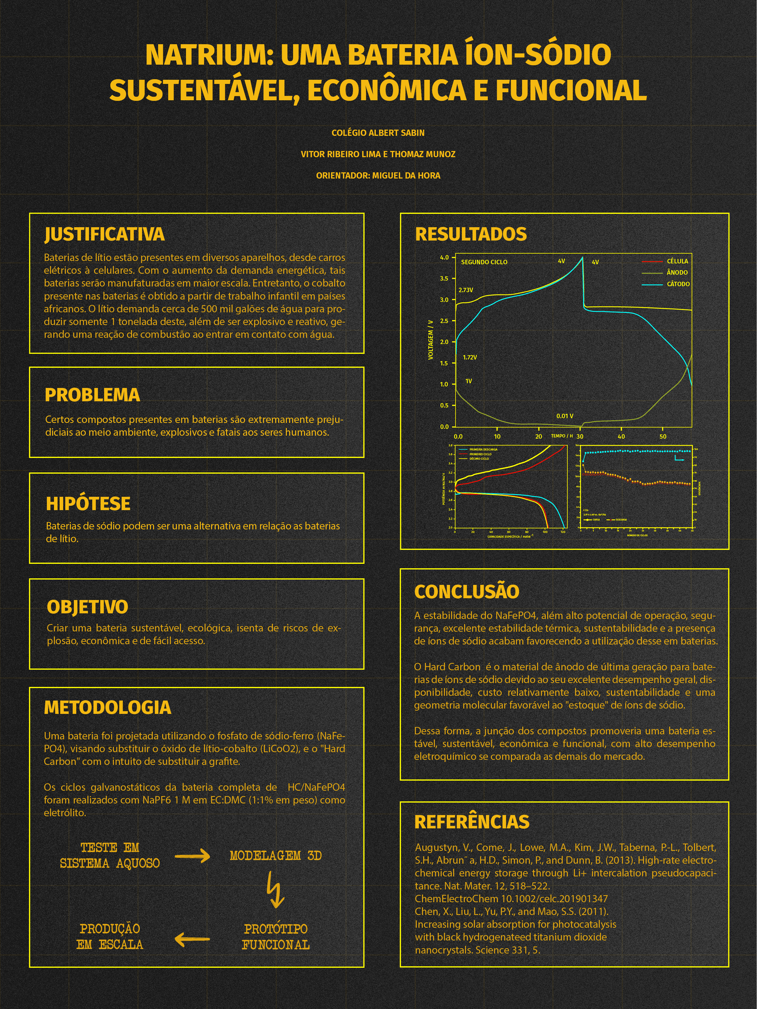 Sabe-se que diversas baterias secundárias (baterias recarregáveis) geram diversos impactos ambientais quando descartadas incorretamente, um alto custo de produção e um processo de extração extremamente prejudicial ao meio ambiente e aos seres humanos presentes na atividade em questão. Devido a isso, pesquisadores têm realizado buscas por baterias com elevado potencial elétrico e ambientalmente amigáveis. O NaFePO4, por sua vez, apresenta propriedades ideais para o papel de catodo (polo positivo da bateria), devido à sua baixa reatividade com a água, baixo custo, e fácil produção. Por outro lado, o “Hard Carbon” é um carreador de sódio promissor devido às suas boas características de intercalação/desintercalação e reação de capacitância de superfície, sendo, portanto, um ânodo (polo negativo da bateria) ideal. Mediante isso, este artigo proverá a proposição da criação de um novo tipo de bateria, que contenha os compostos mencionados, por meio de testes individuais em sistemas aquosos.