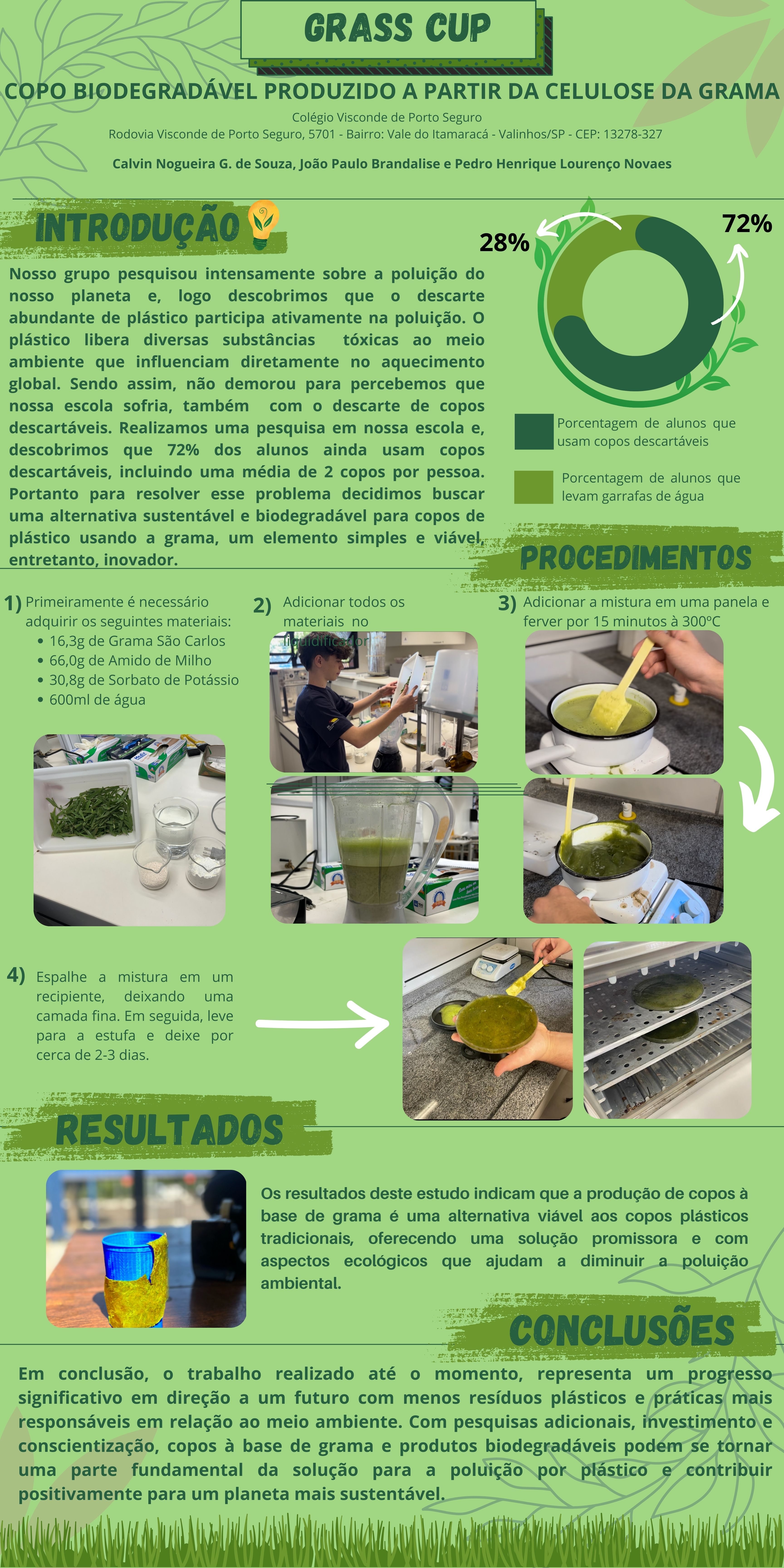 Este trabalho aborda a problemática do descarte de plástico e seus impactos no meio ambiente, com ênfase na poluição e decomposição lenta do material. Propõe a criação de copos descartáveis biodegradáveis feitos de celulose de grama como alternativa sustentável ao plástico. Destaca a urgência da mudança, dadas as quantidades massivas de copos plásticos usados diariamente. Enfatiza a importância da conscientização ambiental, reciclagem e práticas sustentáveis como responsabilidade coletiva para preservar o planeta.