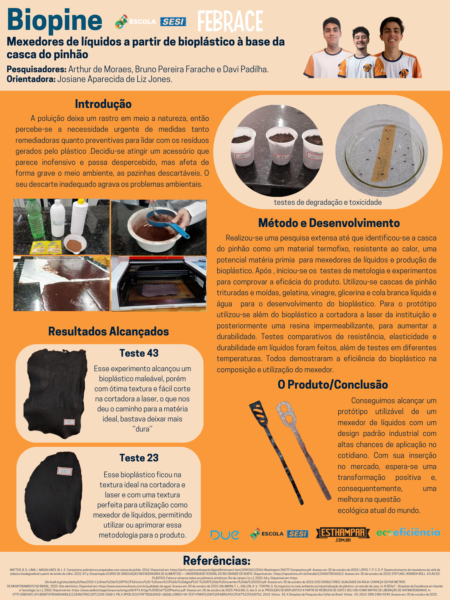 O resíduo plástico é considerado atualmente um dos grandes vilões ambientais, visto que provém de fontes não renováveis à base de petróleo. Além disso, o material plástico demora mais de 400 anos para se decompor no ambiente, fato que é potencializado quando possui vida útil de curta duração, o que ocorre com os plásticos de uso único, a exemplo dos mexedores de café. Com o crescimento populacional, a procura e utilização do material plástico convencional na indústria de alimentos só aumenta. Pensando em uma alternativa mais sustentável que o plástico convencional, este trabalho propõe o desenvolvimento e o teste de mexedores de café de bioplástico à base da casca do pinhão de baixo custo e alta eficiência. O projeto utilizou como principal matéria-prima cascas de pinhão trituradas e moídas e, como materiais secundários, gelatina, vinagre, glicerina, cola branca líquida e água. Para o protótipo, foi utilizado, além do bioplástico, a cortadora a laser da instituição e, posteriormente, uma resina impermeabilizante para aumentar a durabilidade. Testes comparativos de resistência, elasticidade e durabilidade em líquidos foram feitos e aprovados, além de testes em diferentes temperaturas. Todos demonstraram a eficiência do mexedor. Atualmente, os projetos futuros se concentram em mais testes de análises químicas, empreendedorismo do projeto e a implementação do mexedor na unidade de ensino da Escola Sesi em São José.