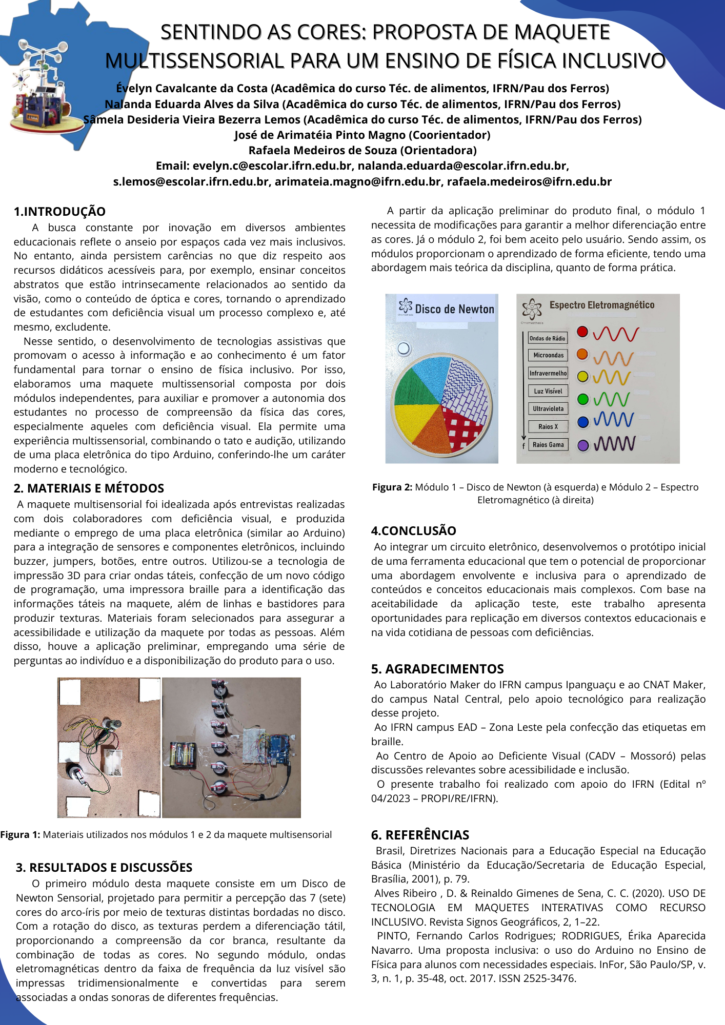 Os espaços educacionais ainda não oferecem amplamente os recursos didáticos necessários para uma educação inclusiva, que garanta a autonomia e aprendizagem dos estudantes com necessidades específicas. No IFRN - Campus Pau dos Ferros, alunos com deficiência visual são maioria dentre PcDs que frequentam a instituição. Assim, proporcionar acesso ao conhecimento adquirido essencialmente através da visão, como o conceito de cores na física, é imprescindível. O desenvolvimento de tecnologias assistivas que promovam o acesso à informação e ao conhecimento científico mostra-se relevante na tarefa de tornar o ensino de física inclusivo. Nesse contexto, pretende-se investigar o processo de aprendizagem de estudantes com deficiência visual e produzir uma maquete multissensorial interativa, que ofereça recursos para uma melhor compreensão do conteúdo de óptica, utilizando relações de sinestesia. Para isto, a pesquisa propõe uma integração da maquete com a placa eletrônica Arduino e seus sensores, além da utilização de etiquetas em Braile para identificação de informações relevantes na construção do protótipo. Espera-se que a maquete seja validada por pessoas com deficiência visual e que possa ser replicada, também, em outros contextos educacionais, seja para a realidade de pessoas com deficiências distintas ou para outras disciplinas. Por fim, o produto educacional visa contribuir para a criação de recursos didáticos acessíveis, além de facilitar a inclusão de pessoas com deficiência visual no ensino de física experimental, fomentar discussões sobre a importância da tecnologia assistiva e a conscientização sobre a importância da acessibilidade e da inclusão