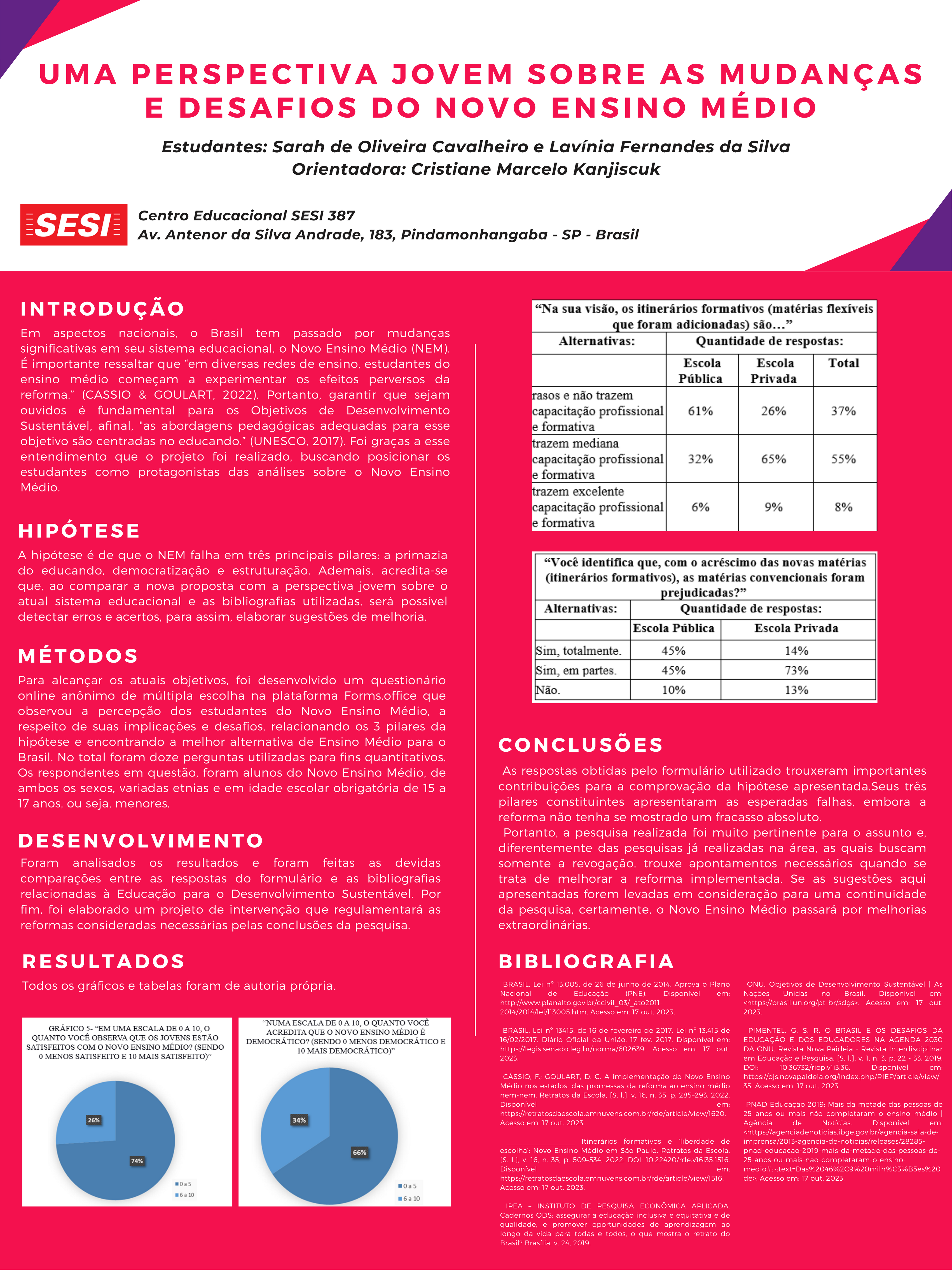Em aspectos nacionais, o Brasil tem passado por mudanças significativas em seu sistema educacional, o Novo Ensino Médio (NEM). É importante ressaltar que “em diversas redes de ensino, estudantes do ensino médio começam a experimentar os efeitos perversos da reforma” (CASSIO & GOULART, 2022). Portanto, garantir que sejam ouvidos é fundamental para os Objetivos de Desenvolvimento Sustentável, afinal, "as abordagens pedagógicas adequadas para esse objetivo são centradas no educando” (UNESCO, 2017). A Educação para o Desenvolvimento Sustentável (EDS) deve ser pensada para os estudantes, então por que não os tornar peças-chave para o entendimento do atual sistema educacional? Foi graças a esse entendimento que o projeto foi realizado, buscando posicionar o educando como protagonista das análises sobre o Novo Ensino Médio. A hipótese é de que o NEM falha em três principais pilares: a primazia do educando, democratização e excelente estruturação. Ademais, acredita-se que, ao comparar a nova proposta com a perspectiva jovem sobre o atual sistema educacional e as bibliografias utilizadas, será possível detectar erros e acertos, para assim elaborar sugestões de melhoria. Para alcançar os atuais objetivos, foi desenvolvido um questionário online, anônimo, de múltipla escolha, que observou a percepção dos estudantes a respeito de suas implicações e desafios. As respostas obtidas trouxeram importantes contribuições para a comprovação da hipótese apresentada. Seus três pilares constituintes apresentaram as esperadas falhas. Por fim, vale ressaltar que a pesquisa realizada foi muito pertinente para o assunto e, diferentemente das pesquisas já realizadas na área, as quais buscam somente a revogação, trouxe apontamentos necessários quando se trata de melhorar a reforma implementada. Se as sugestões apresentadas forem levadas em consideração para uma continuidade da pesquisa, certamente o Novo Ensino Médio passará por melhorias extraordinárias.