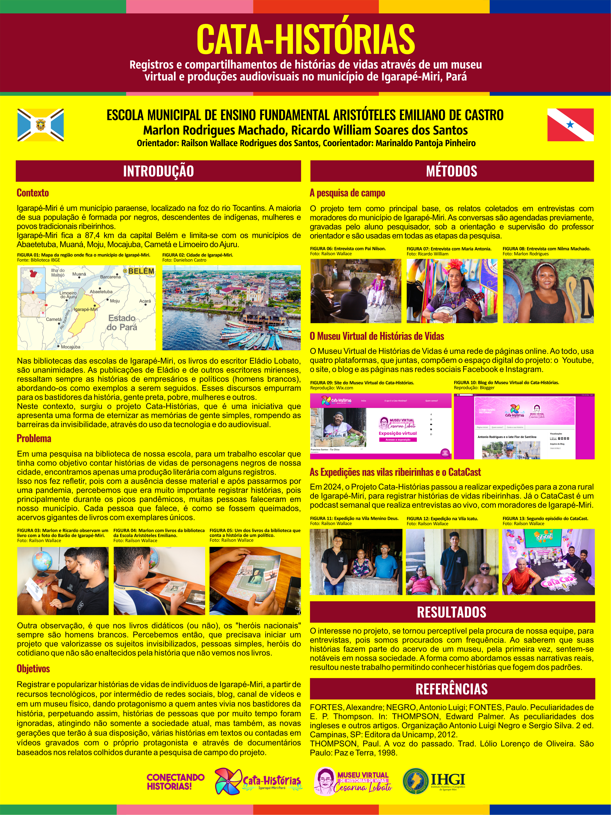 O projeto Cata-Histórias foi criado com o objetivo de registrar e compartilhar histórias de vida de pessoas de Igarapé-Miri, município localizado na região do nordeste paraense. A ideia surgiu após a leitura de um livro de um escritor miriense, que abordava vários fatos históricos de Igarapé-Miri e elencava uma lista de “homens notáveis” que, segundo ele, ajudaram a construir a nossa história, sendo todos esses “cidadãos ilustres” homens brancos, geralmente políticos e ricos, excluindo pobres, moradores de periferias, negros, mulheres e outras pessoas que não se encaixam nesse padrão tão exaltado. Nas nossas periferias e áreas ribeirinhas, existem várias personalidades que colaboram de forma assídua para a cultura, educação, esportes e outras áreas da nossa sociedade. Essas pessoas, por não serem escritoras ou por não dominarem outros tipos de mídias, vivem às margens da história e acabam não registrando as suas trajetórias de vidas, tornando-se desconhecidas da maioria da população miriense, mesmo tendo vivências riquíssimas para compartilhar. O projeto Cata-Histórias registra essas histórias de vidas através dos relatos da própria pessoa ou dos seus descendentes (caso já falecida), usando como objeto principal entrevistas gravadas em vídeos, áudios e registros fotográficos, e criando, a partir desse material, documentários e postagens em plataformas. Todo esse material auxilia na divulgação e no processo de perpetuação dessas histórias de vidas, protagonizando personagens que, até então, não teriam a oportunidade de compartilharem suas vivências e realizações pessoais ou coletivas.