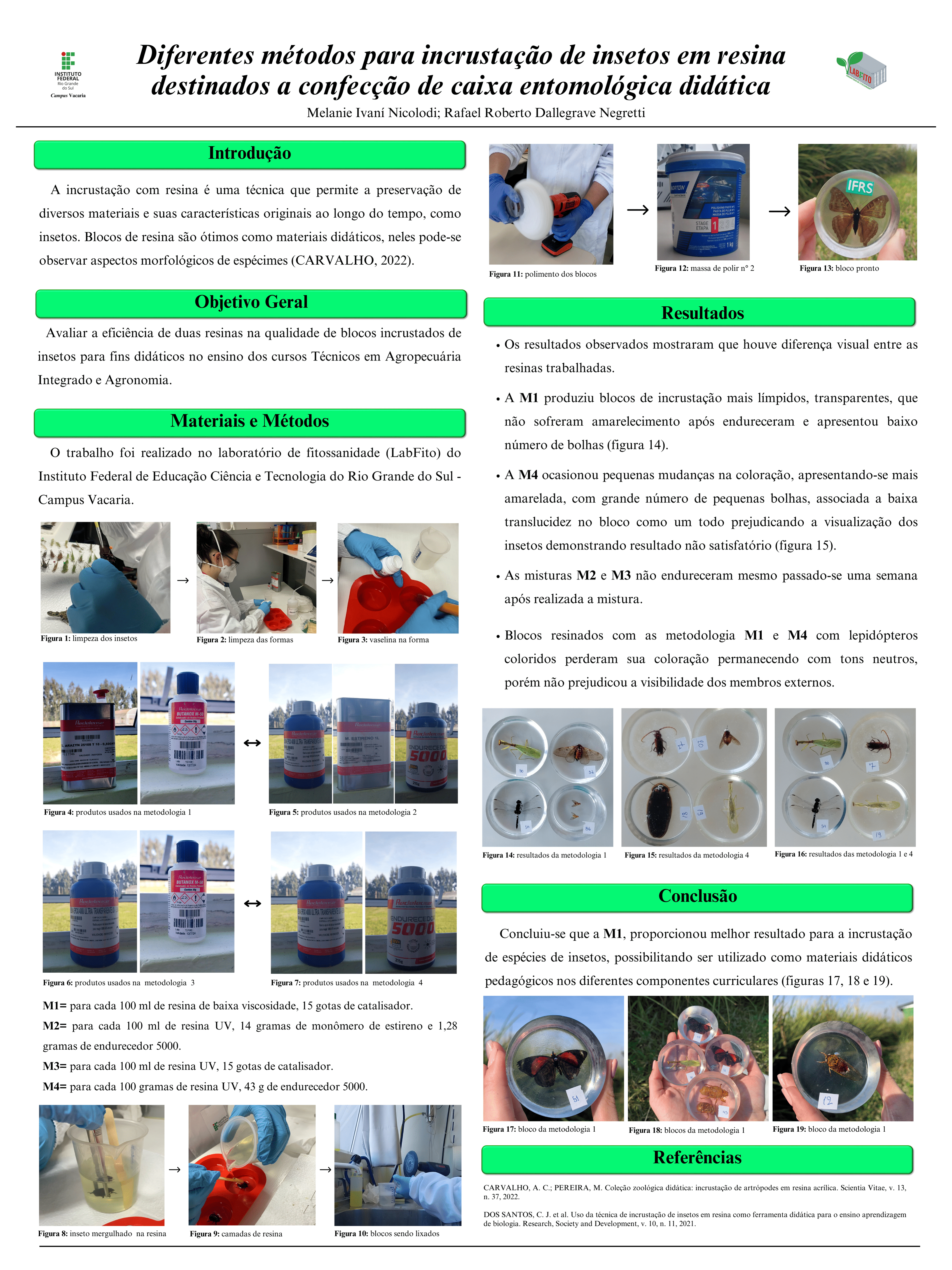 A incrustação com resina é uma técnica que permite a preservação de diversos materiais e suas características originais ao longo do tempo, transformando-se em ótimos materiais didáticos. Este trabalho objetiva avaliar a eficiência de duas resinas na qualidade de blocos incrustados de insetos para fins didáticos no ensino dos cursos técnicos em agropecuária integrado e agronomia. O trabalho foi realizado no laboratório de fitossanidade (LabFito) do IFRS - Campus Vacaria. Os insetos utilizados foram oriundos de caixas entomológicas, entregues na forma de trabalho. Inicialmente foi realizada a secagem em estufa a 40°C durante 48 horas, seguido de higienização dos insetos e das formas de silicone com álcool 70% para a remoção de resíduos. Após a limpeza, foi aplicada vaselina com pincel para auxiliar na remoção do bloco das formas. Foram testadas quatro metodologias: M1) em 100 gramas de resina cristal de baixa viscosidade, de adicionou-se 15 gotas de catalisador. M2) a cada 100 ml de resina com proteção UV, 14 g de monômero de estireno e 1,28 g de endurecedor 5000. M3) a cada 100 ml de resina com proteção UV, 15 gotas de endurecedor 5000. M4) em 100 gramas de resina epóxi 4008 ultra transparente com proteção UV foi adicionado 43 gramas de endurecedor 5000. Os resultados mostraram que houve diferença visual entre as resinas. A M4 ocasionou pequenas mudanças na coloração, apresentando-se mais amarelada, com grande número de pequenas bolhas, associada a baixa translucidez no bloco como um todo prejudicando a visualização dos insetos demonstrando resultado não satisfatório. A M1 produziu blocos de incrustação mais límpidos, transparentes, que não sofreram amarelecimento após secagem e apresentou baixo número de bolhas. Já as misturas M2 e M3 não endureceram. Concluiu-se que a metodologia M1, proporcionou melhor resultado para a incrustação de espécies de insetos, podendo ser utilizado como material didático pedagógico nos diferentes componentes curriculares.