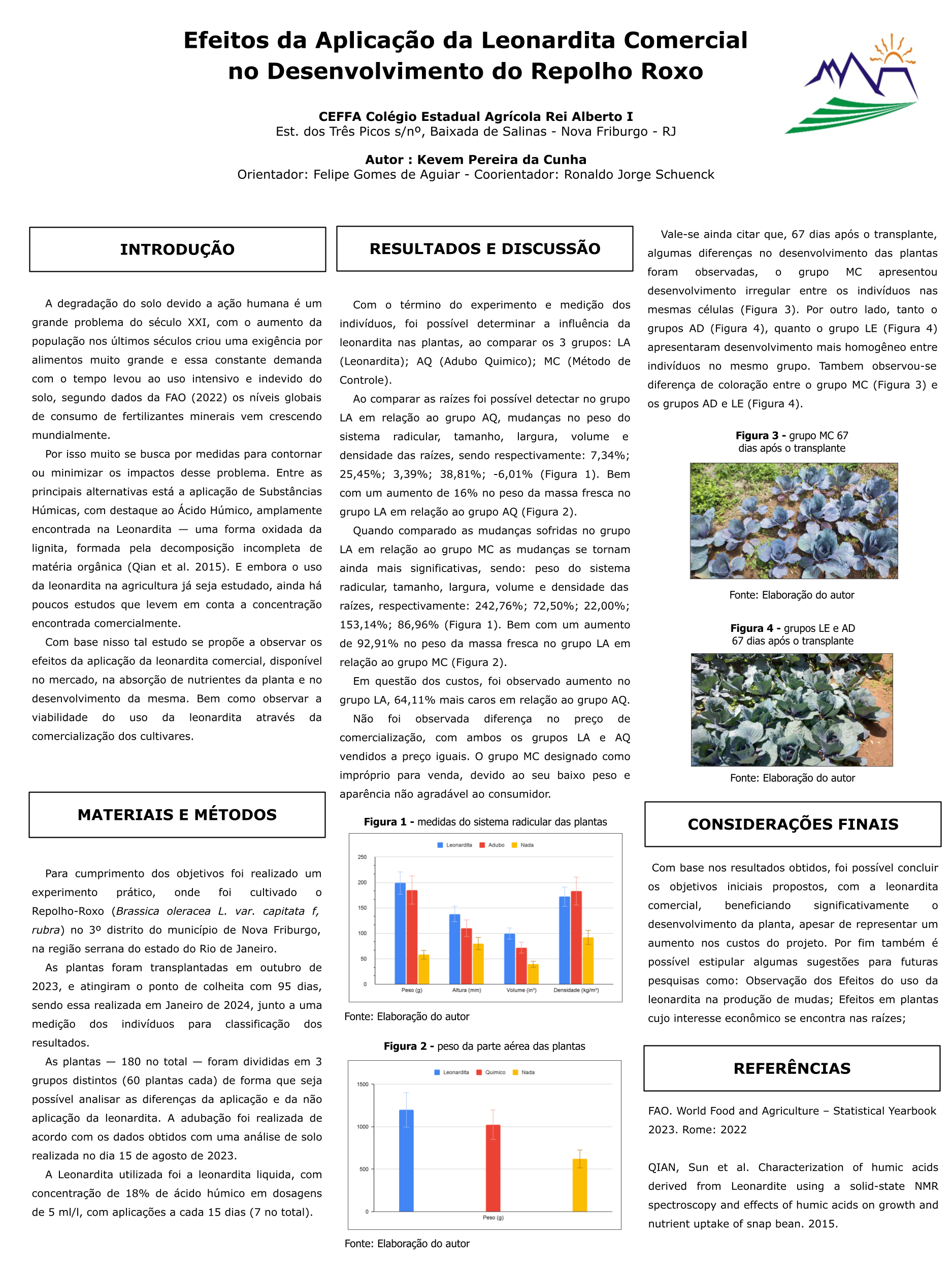 O uso intensivo de fertilizantes sintéticos com o tempo tem causado sérios problemas ambientais, como a diminuição da fertilidade do solo. Com isso, esse estudo se coloca com o objetivo de observar os efeitos do uso da leonardita disponível no mercado como fonte de ácido húmico (AH) no cultivo do repolho-roxo (Brassica oleracea L. var. capitata f, rubra) de forma a aumentar a produtividade da mesma. O experimento foi conduzido, sendo feito o cultivo do repolho roxo a céu aberto, os cultivares foram divididos em grupos (LE, AD) e o método de controle (MC), e receberam em essencialmente o mesmo tratamento (com exceção do grupo MC) sendo diferido somente que um grupo recebeu a aplicação da leonardita líquida com teor de 18% de ácido húmico, após o fim do ciclo das plantas, as mesma foram colhidas e tiveram suas dimensões medidas e comparadas. Os resultados mostram uma melhora no peso da parte aérea da planta e um aumento significativamente maior nas dimensões do sistema radicular da mesma, adicionalmente também foi observado um aumento no custo do grupo que recebeu a aplicação da leonardita, não tendo sido observadas quaisquer outras mudanças significativas como suscetibilidade a pragas e doenças e afins. No fim conclui-se que os objetivos foram atingidos, entretanto o projeto ainda abre possibilidades para continuações, tendo em vista que muitas outras possibilidades foram observadas ao fim do mesmo.