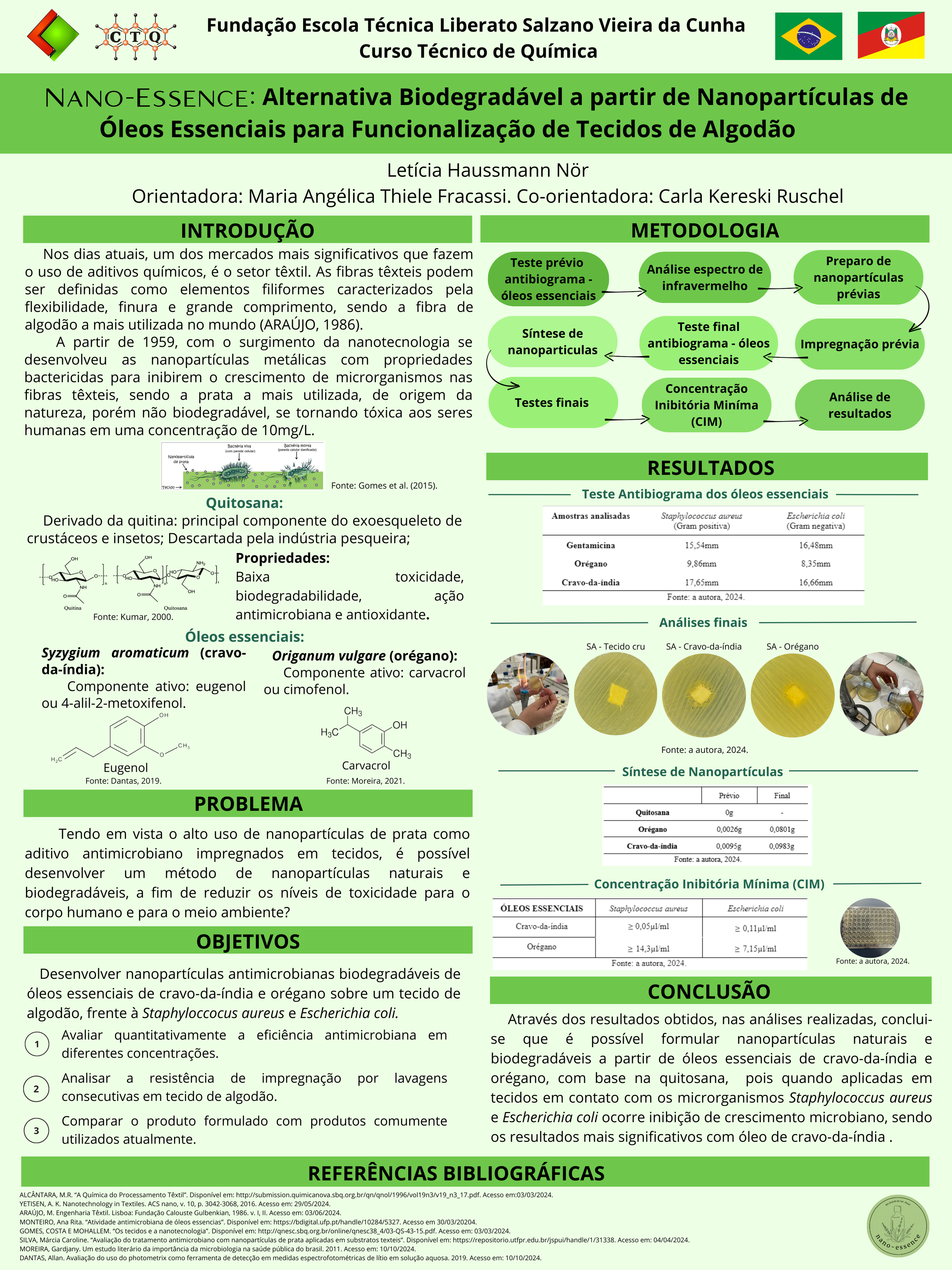 A pesquisa consistiu na preparação de nanopartículas de óleos essenciais de cravo-da-índia e orégano, utilizando quitosana, para controle de crescimento de microrganismos em tecidos de algodão. A estrutura de fibras têxteis proporcionam um ambiente propício para o crescimento de microorganismos, logo, se reforça a importância de buscas naturais para este setor. Atualmente se faz o uso de nanopartículas de prata, de meio natural porém não biodegradável e tóxica, e que quando em contato com nanomateriais tem sua superfície de contato aumentada, ocasionando em uma maior permeabilidade em nossa pele. Para diminuir estes impactos, formulou-se nanopartículas a partir da quitosana, que é extraída da quitina, o principal componente do exoesqueleto de crustáceos e insetos, e que possuem propriedades antimicrobianas e de biodegradabilidade. Após, se fez a adição de óleo essencial de cravo-da-índia com a presença do eugenol, que teve um halo de inibição de crescimento de 16,66mm e 17,65mm, e o óleo de orégano com o carvacrol, que apresentou halo de 8,35mm e 9,86mm, ambos para Escherichia coli e Staphylococcus aureus, respectivamente, demonstrando que atuam com funções antimicrobianas. Portanto para a formação das nanopartículas fez-se a adição da quitosana, ácido acético, óleos essenciais, tripolifosfato de sódio e Tween 80 para diminuir as tensões interfaciais do óleo, e ao final, se fez centrifugação por 10 minutos, filtração simples e estufa de 20°C para secagem das nanopartículas. As nanopartículas de orégano resultaram em 0,0801g e de cravo-da-índia foi de 0,0983g, após realizou-se a impregnação no tecido de algodão, pelo método de embebedamento onde o tecido ficou imerso na solução contendo as nanopartículas por 10 minutos, e incubação por 24 horas. Após 24 horas fez-se a análise do resultado. Por fim, concluiu-se que é possível realizar nanopartículas de origem natural e biodegradável, pois mesmo utilizado uma pequena quantidade no tecido testado já houve inibição de crescimento.