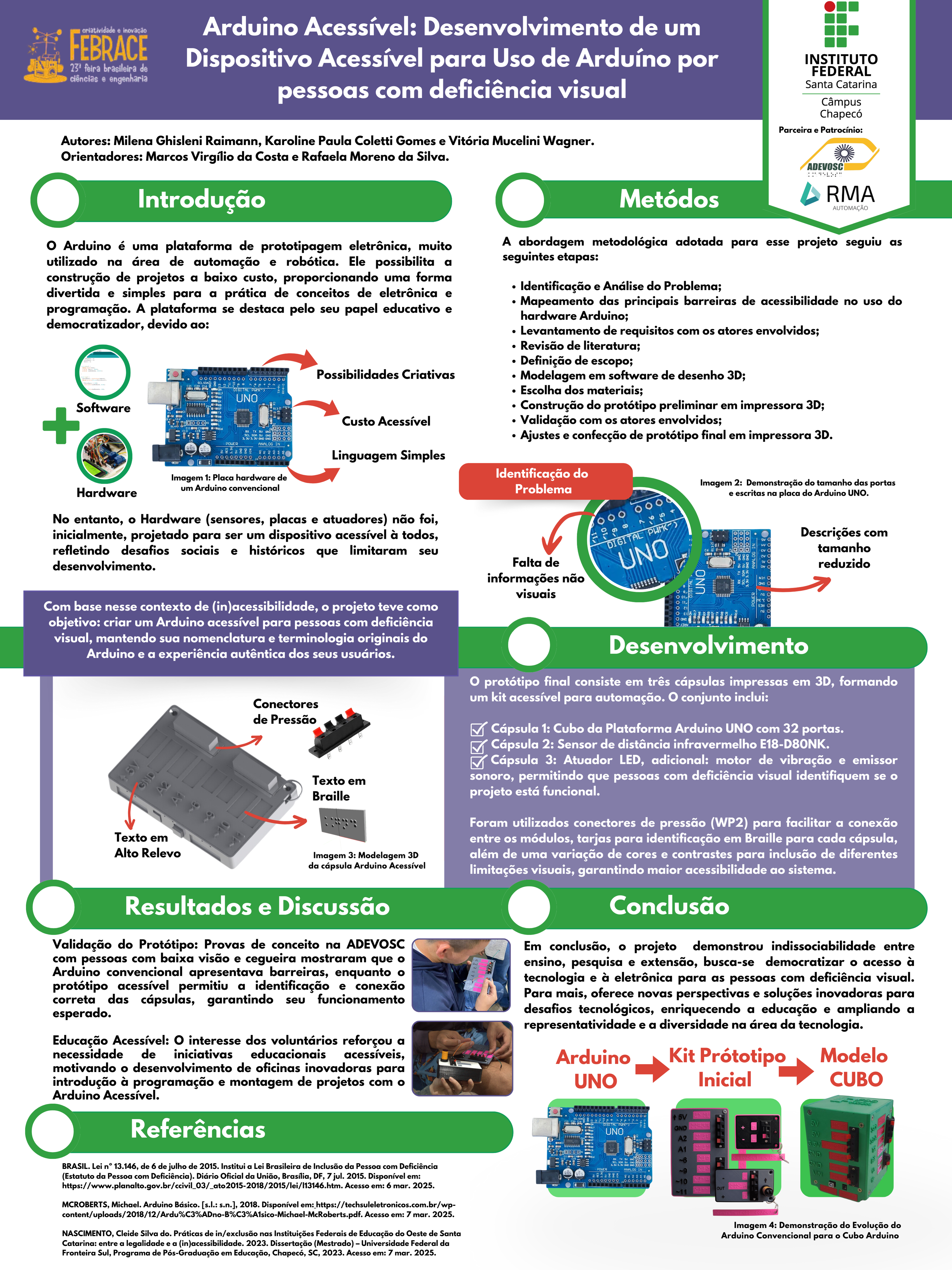 No ambiente educacional, a acessibilidade é um desafio para educadores de diversas áreas, principalmente quando as atividades práticas se baseiam em equipamentos e ou ferramentas que não foram pensadas no contexto inclusivo. No curso técnico em desenvolvimento de sistemas integrado ao ensino médio do Campus Chapecó, é utilizada a plataforma de prototipagem em automação denominada Arduino para atividades práticas em diversas unidades curriculares. Quando o curso recebeu seu primeiro estudante com deficiência visual, foi identificado o grande desafio de utilizar a plataforma Arduino que não foi pensada para esse público. Apesar de existirem ferramentas acessíveis para a parte de programação (software), o uso do hardware em si, as placas, cabos e componentes eletrônicos não possuem nenhuma informação tátil, ou seja, nenhuma acessibilidade. Percebendo esse cenário, surgiu a iniciativa para tornar o Arduino um dispositivo de uso acessível para todos, sem alterar a nomenclatura e terminologia original do fabricante. Foram então desenvolvidas cápsulas com textos em alto relevo, escritas em Braille e conectores de pressão, que permitem o uso tátil do hardware do Arduino, mas especificamente do Arduino UNO. O protótipo do dispositivo desenvolvido foi validado por pessoas com baixa visão e cegueira, com o apoio da ADEVOSC (Associação de Deficientes Visuais do Oeste de Santa Catarina), obtendo sua aprovação na montagem de um projeto básico com o Arduino, agora acessível.