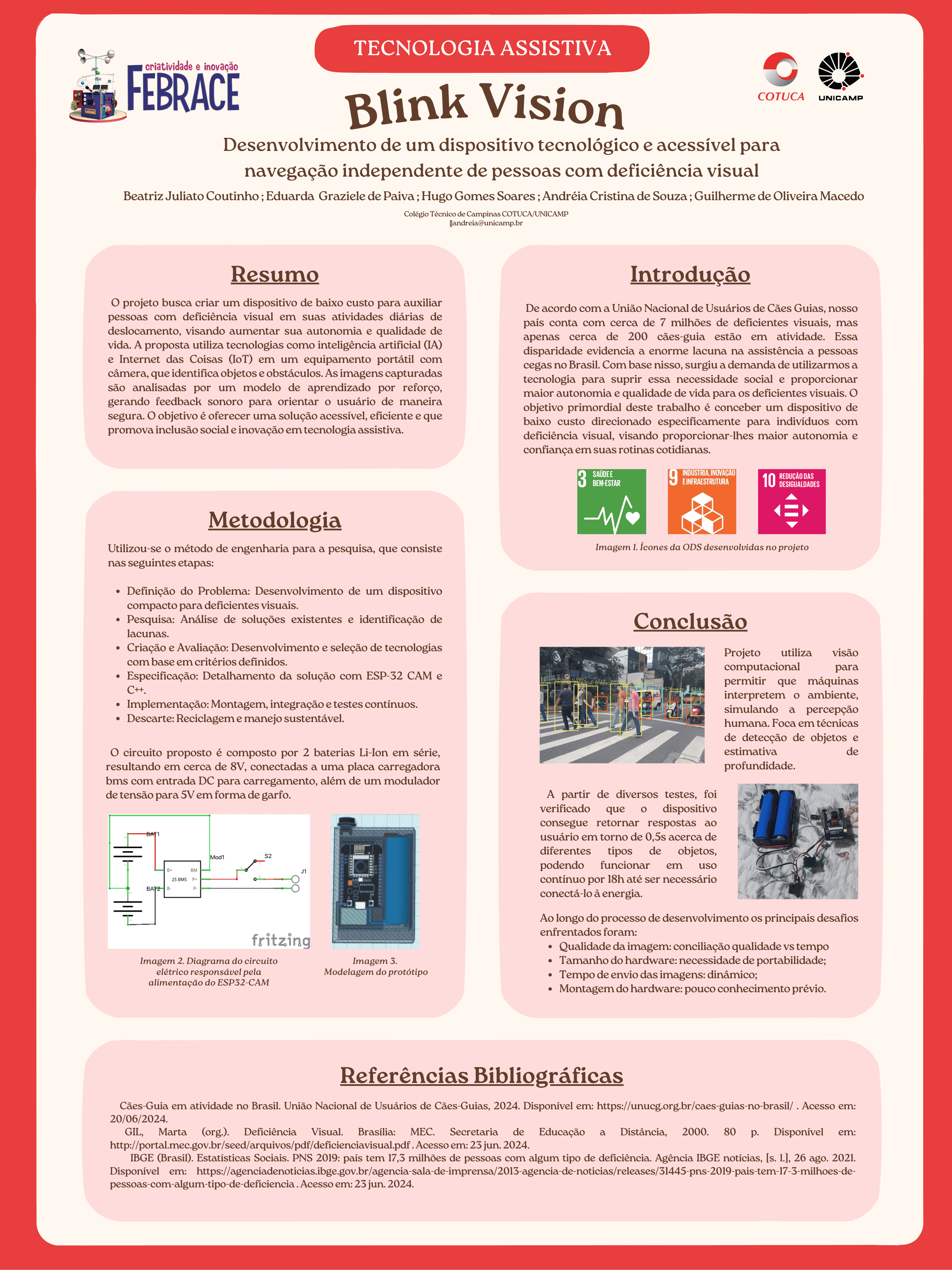 Atualmente, o Brasil conta com cerca de 7 milhões de pessoas com deficiência visual, mas apenas cerca de 200 cães-guia estão em atividade, segundo a União Nacional de Usuários de Cães Guias (UNUCG, 2024). Essa disparidade revela uma lacuna significativa na assistência a essa população. Este projeto busca utilizar a tecnologia para atender a essa necessidade, criando um dispositivo de baixo custo que auxilia deficientes visuais em suas atividades diárias de locomoção, promovendo maior autonomia e confiança. A proposta envolve o desenvolvimento de um dispositivo portátil e de fácil integração à rotina dos usuários, utilizando inteligência artificial e internet das coisas (IoT). O dispositivo contará com uma câmera para identificar objetos e obstáculos ao redor do usuário. As imagens capturadas serão analisadas por um modelo de inteligência artificial, que fornecerá feedbacks sonoros sobre a presença de obstáculos, garantindo maior segurança e independência. Este dispositivo visa não apenas melhorar a mobilidade e segurança das pessoas com deficiência visual, mas também contribuir para a inovação em tecnologia assistiva, oferecendo uma solução acessível e eficaz.