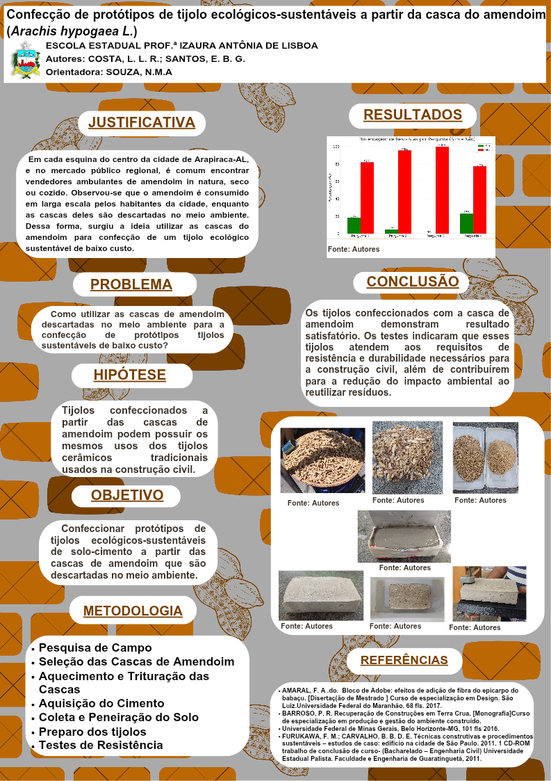 Os tijolos de solo-cimento ecológicos são uma alternativa sustentável para construção civil, e podem ser utilizados em vários tipos de construções, com semelhança aos tijolos cerâmicos tradicionais. Este estudo tem o objetivo de confeccionar protótipos de tijolos de solo-cimento a partir das cascas do amendoim descartadas no meio ambiente. Para confecção do tijolo ecológico foram utilizadas as matérias primas tradicionais que são: o solo, o cimento, a água e as cascas de amendoim trituradas, que foram inseridas na formulação. Para moldar os tijolos foram adquiridas caixas de leite tetra pak de um litro. Observou-se que a textura dos tijolos confeccionados apresentavam compatibilidade com as dos tijolos tradicionais. O tempo de cura foi de 1 a 14 dias, assim como a prova de resistência. Após o período de cura do produto elaborado, mostrou-se com resultados favoráveis suficientes para serem utilizados em construção civil.