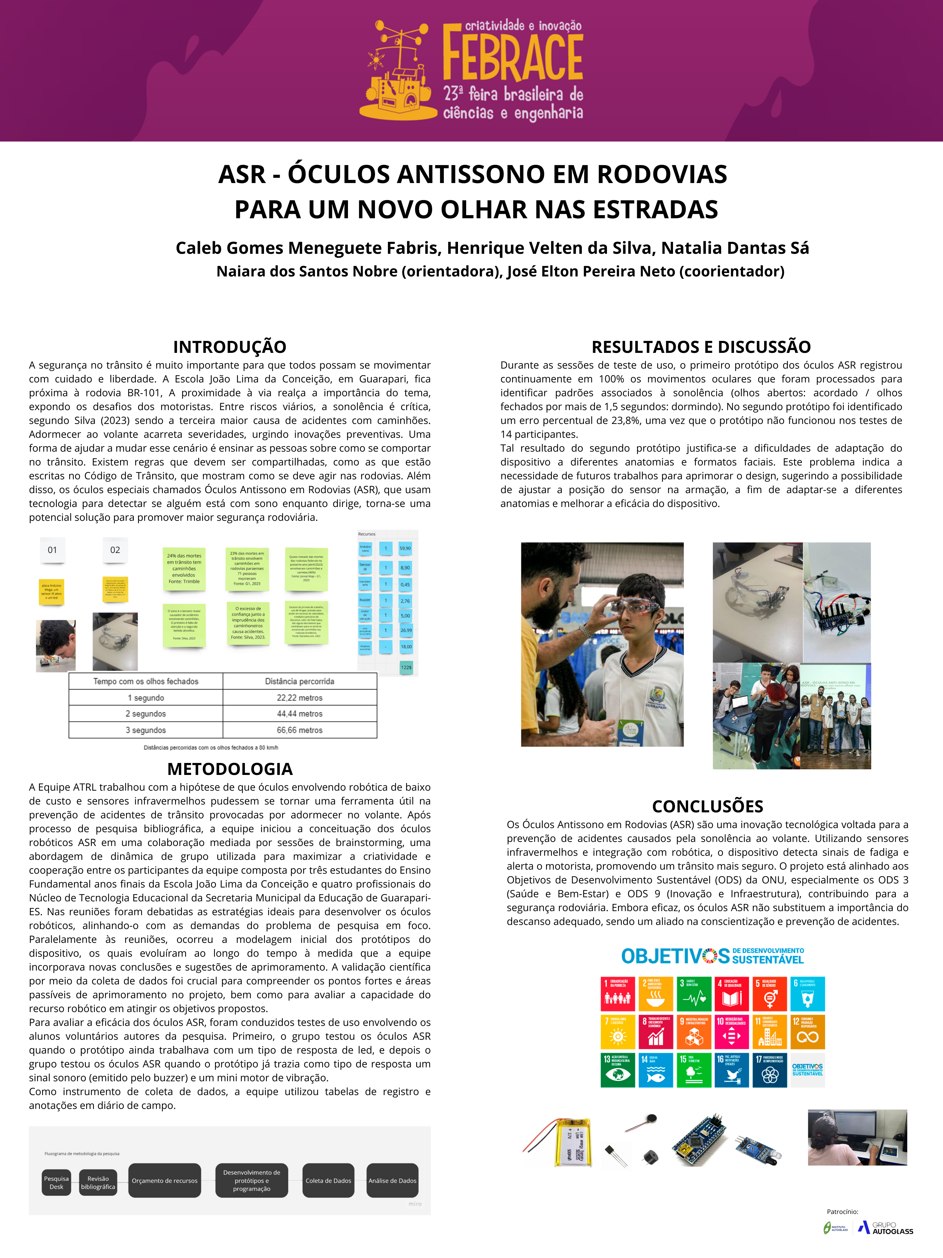 A presente pesquisa aborda a importância da discussão sobre a segurança nas estradas com destaque para a rodovia BR-101, onde a comunidade escolar da E.M.E.I.E.F. João Lima da Conceição de Guarapari - ES, localizada em seu entorno, vivencia problemas de segurança viária. Um dos principais fatores de risco em acidentes de trânsito é a sonolência do motorista, sendo considerada a terceira maior causa de acidentes envolvendo caminhões. O estudo propõe o uso de tecnologia robótica, especificamente os "Óculos antissono em rodovias" (ASR), como solução inovadora para prevenir acidentes causados por adormecer ao volante. O trabalho explora métodos de detecção de sonolência por meio de sensores infravermelhos e Arduino e destaca o potencial da robótica na redução de acidentes de trânsito. Durante os testes com dois protótipos dos óculos ASR, foi observado que o primeiro protótipo registrou consistentemente 100% dos movimentos oculares, processados para identificar padrões associados à sonolência (olhos abertos indicando estar acordado; olhos fechados por mais de 1,5 segundos indicando estar dormindo). No entanto, no segundo protótipo, foi identificado um erro percentual de 23,8% durante testes de uso, devido a dificuldades de adaptação do dispositivo a diferentes anatomias e formatos faciais. Este problema indica a necessidade de futuros trabalhos para aprimorar o design, sugerindo a possibilidade de ajustar a posição do sensor na armação, a fim de adaptar-se a diferentes anatomias e melhorar a eficácia do dispositivo. O estudo conclui que os óculos ASR representam um passo importante na prevenção de acidentes viários devido à sonolência, mas enfatiza que essa tecnologia deve ser complementada por medidas preventivas e conscientização sobre segurança no trânsito com medidas de autocuidado para garantir a segurança tanto dos motoristas quanto dos passageiros nas estradas.