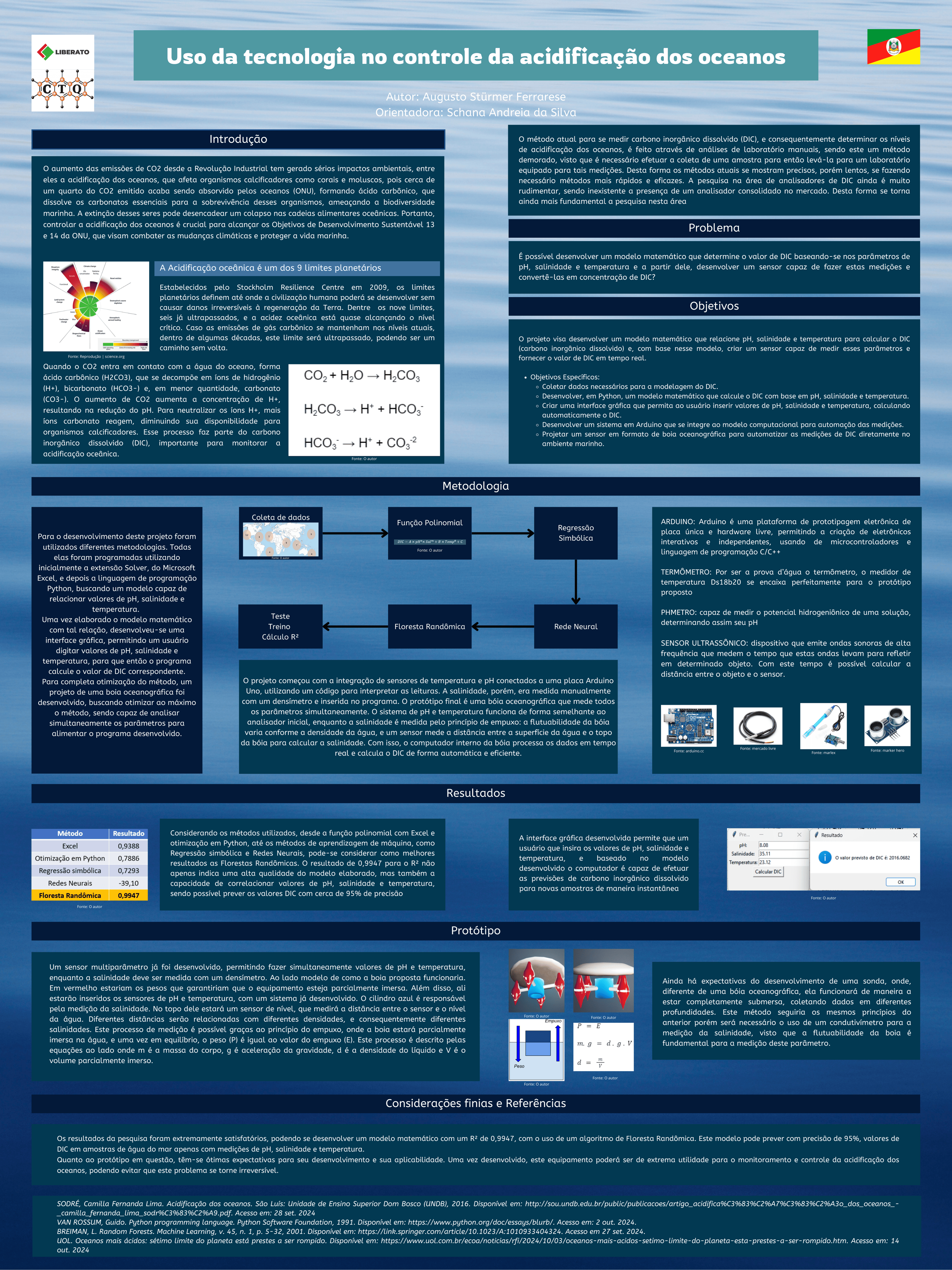 Desde a Revolução Industrial, o aumento das emissões de CO2 pela queima de combustíveis fósseis, atividades industriais e queimadas agrícolas tem elevado a absorção de CO2 pelos oceanos, formando ácido carbônico (H2CO3) e intensificando a acidificação das águas. Esse fenômeno ameaça organismos calcificadores, moluscos e corais, além de plânctons, prejudicando as cadeias alimentares marinhas e ecossistemas oceânicos. Os métodos tradicionais para medir carbono inorgânico dissolvido (DIC) são lentos e exigem infraestrutura laboratorial específica, sem equipamentos comerciais amplamente acessíveis. Diante disso, o projeto visa desenvolver um modelo matemático para estimar a concentração de DIC rapidamente, usando pH, salinidade e temperatura. Dados do portal NCEI foram usados em quatro metodologias: ajuste de uma função polinomial no Excel para relacionar pH, salinidade, temperatura e CO2; otimização do modelo em Python com técnicas de ajuste de curva; regressão simbólica em Python para encontrar uma equação representativa; e redes neurais artificiais com a biblioteca Scikit-learn, treinando o modelo para identificar as relações complexas entre os parâmetros. A floresta randômica foi usada como técnica complementar, resultando em maior precisão. Para tornar o método prático, uma interface gráfica foi desenvolvida, permitindo inserir os valores e obter rapidamente a concentração de DIC. Também foi criado um protótipo com Arduino UNO e sensores de pH, salinidade e temperatura para medições diretas. A solução tem potencial para mitigar a acidificação dos oceanos, oferecendo uma alternativa prática e contribuindo para a preservação dos ecossistemas marinhos.