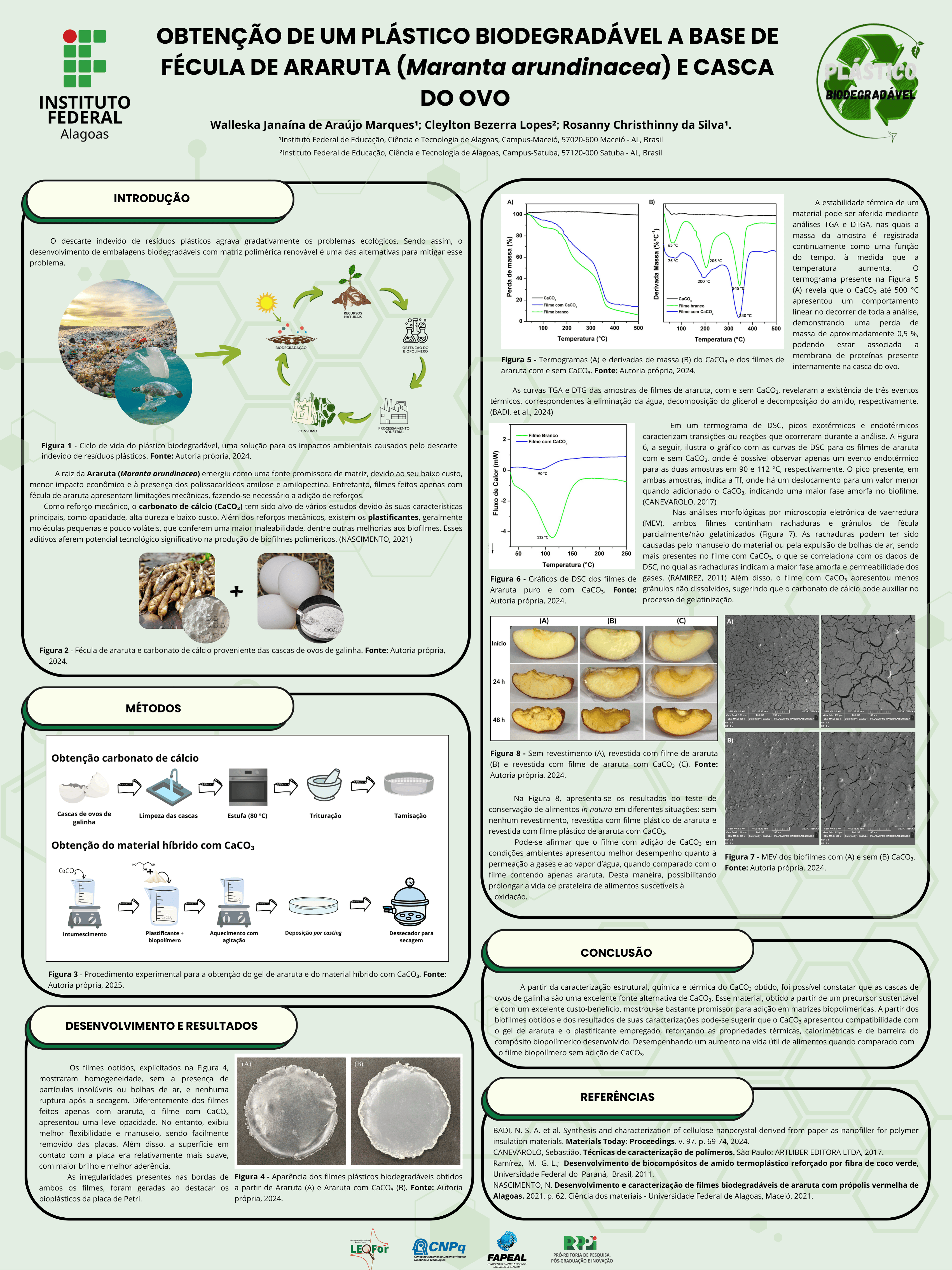 O desenvolvimento de embalagens biodegradáveis com matriz polimérica é desejável, e o interesse no emprego de matérias-primas provenientes de recursos renováveis para a produção de plásticos vem crescendo. Dentre os biopolímeros mais promissores para este fim estão os amidos e féculas de diversas fontes botânicas, que são biodegradáveis, têm baixo custo e estão disponíveis em todo o mundo. Diante disto, este trabalho apresenta a obtenção de um plástico biodegradável à base de fécula de araruta (Maranta arundinaceae) e carbonato de cálcio, proveniente da casca de ovo, como reforço para matriz polimérica; os materiais obtidos foram submetidos a caracterizações térmicas (TGA/DTG e DSC), análise estrutural por infravermelho (FTIR) e análise morfológica por feixe de elétrons (MEV). O material híbrido obtido apresentou potencial para aplicação na indústria como embalagens de alimentos de consumo imediato.