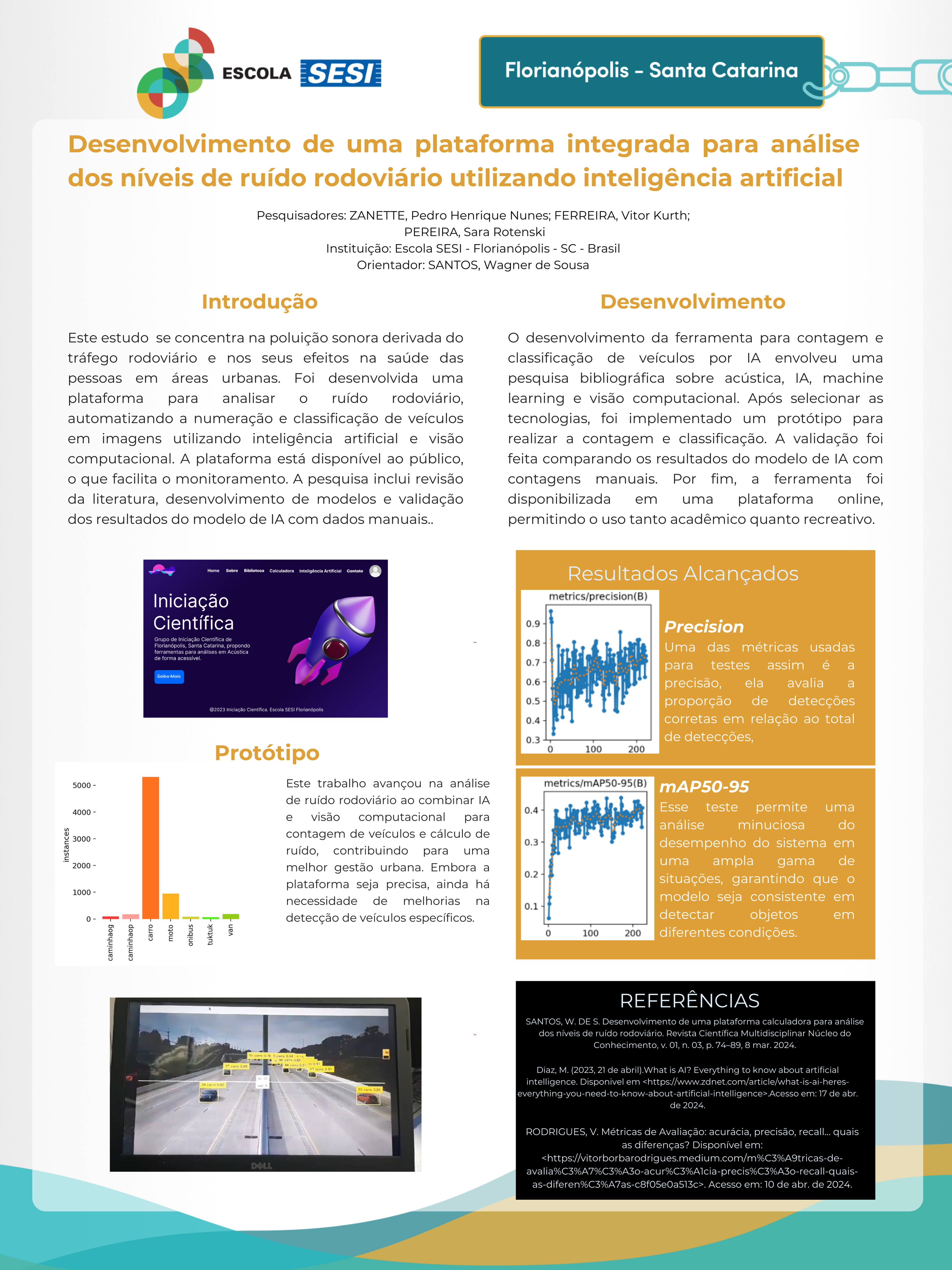 Este estudo propõe uma solução inovadora para o problema do ruído rodoviário por meio do desenvolvimento de uma plataforma computacional que utiliza inteligência artificial (IA) e visão computacional para automatizar a contagem e classificação de veículos em rodovias. A plataforma inclui uma calculadora que estima os níveis de ruído com base em modelos matemáticos de referência internacional, como Hanc e Johnson, focando na análise do impacto do tráfego de veículos na poluição sonora, que afeta a saúde da população. A metodologia envolve a aplicação de algoritmos de aprendizado profundo (deep learning) com a arquitetura YOLO V8 (You Only Look Once) para detecção de objetos em vídeos. A IA foi desenvolvida em Python, enquanto a plataforma foi implementada em TypeScript, garantindo robustez e segurança. A validação foi realizada com métricas de visão computacional, como precisão (precision), recall e mAP50. Os resultados indicam uma precisão média de 0.722%, um recall de 0.544 e um mAP50 de 0.608, refletindo bom desempenho na identificação de veículos, mas apontando a necessidade de melhorias na detecção de classes menos representadas, como vans e ônibus. A ferramenta final oferece uma solução acessível e eficaz para o monitoramento da poluição sonora, beneficiando áreas urbanas afetadas pelo tráfego.