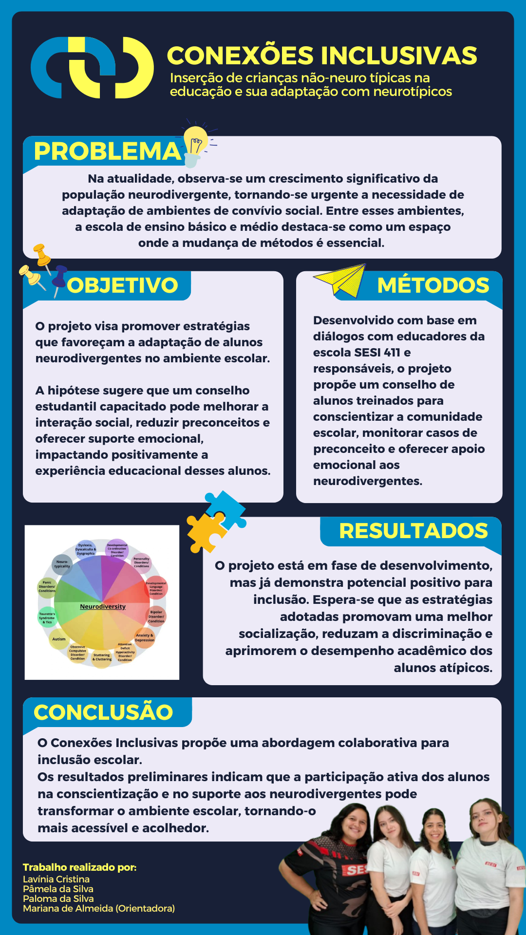 A inclusão de alunos neuro divergentes dentro de salas de aula representa um grande desafio para os centros de educação apesar das inúmeras ferramentas pedagógicas utilizadas para solucionar sem muitos danos aos envolvidos, ainda há reveses que atrasam a integração não excluidora desses alunos. Este trabalho visa a inserção de alunos neuroatípicos nos ambientes de aprendizado e interação com alunos neurotípicos. Após conversas com profissionais da educação que possuem vivência sobre esta adaptação, entendemos que um dos maiores entraves é a convivência insólita dos alunos neurotípicos em relação aos neuro divergentes. Em vista disso, em uma reunião com a coordenadora pedagógica chegamos ao seguinte plano para solucionar este revés. Um projeto em que por meio de um conselho bem estudado formado por pessoas interessadas e selecionadas para que se encaixem no perfil do projeto, que terão um trabalho entre os alunos da sala de aula para que não haja um preconceito e diferenciação entre os estudantes para essa inserção, além do auxílio que proporcionarão aos alunos. A iniciativa foi planejada tendo em vista que na maioria das vezes os profissionais de ensino não veem todas as ocorrências dentro de sala de aula, especialmente em casos de exclusão e bullying. Por isso, com um aluno estando a parte desses casos será mais fácil, e auxiliando os estudantes e professores no ambiente escolar. O projeto, terá um protocolo de iniciação e aprendizado, para que o objetivo de melhor inclusão desses alunos seja atingido com êxito. A proposta ainda está em desenvolvimento, mas é esperado que se o resultado for positivo, será compartilhado o protocolo para que outras unidades de ensino se inspirem nesse programa, contribuindo para um ambiente escolar mais inclusivo. Deste modo a iniciativa busca promover a inclusão respeitosa de alunos neuro divergentes, através de um conselho de alunos escolhidos e bem aparte do tema que atuará para reduzir preconceitos.