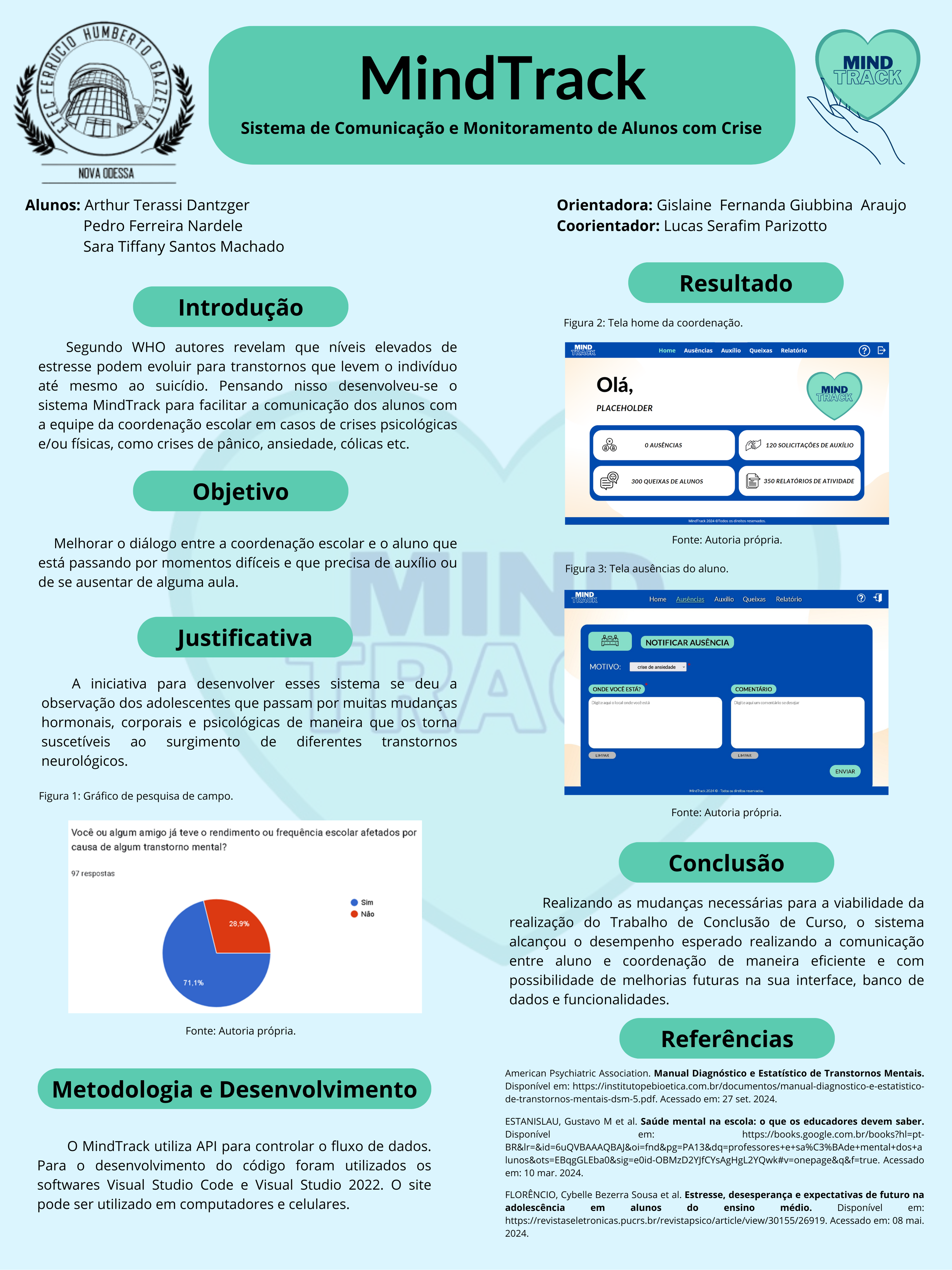 Tendo em vista a frequência crescente de quadros de ansiedade e depressão dentre os adolescentes e a constante pressão e o estresse ligados ao ambiente escolar, levando em consideração a dificuldade de comunicação de pessoas passando por uma crise e o quanto a saúde mental e física do aluno impacta em sua vida e desempenho escolar, o projeto MindTrack busca auxiliar a escola e os estudantes a lidar com casos de crise de ansiedade e de pânico dentro do ambiente escolar, dentre outros possíveis tipos de crise dos quais o aluno possa passar. O trabalho visa uma melhoria na comunicação entre a coordenação da escola e seus alunos, trazendo as funcionalidades de solicitar ajuda, informar ausência e fazer queixa, por parte do aluno, resposta e notificação por parte da coordenação. Assim possibilitando a amenização de possíveis penalidades pela ausência do aluno e uma ajuda para o professor na compreensão de casos dos quais o aluno pode preferir não comunicar pessoalmente ao docente. Ademais, o sistema fornece a possibilidade de analisar a frequência de crises dentro da escola, o que pode ser usado para manter a família ou um profissional capacitado informados sobre a situação da saúde mental do jovem. O estudo foi baseado na análise de artigos científicos e livros, atentando-se à lei e o respeito aos dados referentes à saúde do indivíduo, também tendo utilizado de uma pesquisa de campo para analisar a necessidade do projeto. Para trazer o sistema tanto para celulares quanto para computadores, um site responsivo foi criado, podendo ser acessado por qualquer um dos dois dispositivos desde que tenham acesso à internet.