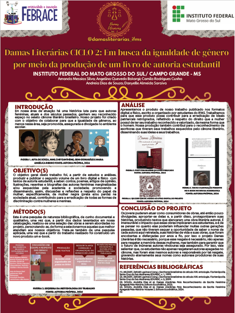Rachel de Queiroz foi a primeira mulher a ocupar uma cadeira na Academia Brasileira de Letras, e só concretizou tal fato 80 anos após sua fundação. Historicamente pouco mais de 3% dos indivíduos que ocuparam uma das cadeiras dos imortais desde a fundação da ABL foram mulheres. Os dados acima mencionados demonstram que as mulheres em nossa área de atuação não têm tido seu trabalho devidamente reconhecido e valorizado, e é isso que motiva nosso trabalho. Nesse contexto e buscando contribuir para que a igualdade de gêneros seja assegurada e disseminada no ambiente escolar, criamos em 2022 o projeto intitulado "Damas literárias", que no momento está em seu segundo ciclo. O objetivo geral deste trabalho é destacar a importância de autoras femininas que, em sua maioria, foram marginalizadas e/ou esquecidas pela academia e sociedade, envolvendo a produção e publicação de um livro com textos de autoria estudantil, a saber: contos, poemas, artigos de opinião, ilustrações, resenhas e biografias. Esta é uma pesquisa de natureza bibliográfica e de cunho documental, pois foi realizada uma catalogação de obras de autoras femininas e de dados relativos às vidas dessas escritoras. Trata-se também de uma pesquisa de cunho qualitativo, uma vez que, a partir dos dados levantados em nossa catalogação, realizamos uma seleção das obras que foram abordadas no projeto, contemplando aquelas que melhor atenderam aos objetivos de nosso trabalho. A partir das discussões e constatações obtidas nas reuniões desse núcleo nasceram um ebook e um livro impresso. Neste segundo ciclo, selecionamos 13 autoras e as dividimos em dois grupos, organizando nosso trabalho em duas frentes: “Damas literárias no contexto geral” e "Damas pretas literárias". Vale salientar que os estudantes não apenas resgataram autoras apagadas no cânone, mas também foram, eles mesmos, autores e responsáveis por tal resgate, gravando eternamente seus nomes como autores, produtores e senhores de suas histórias.