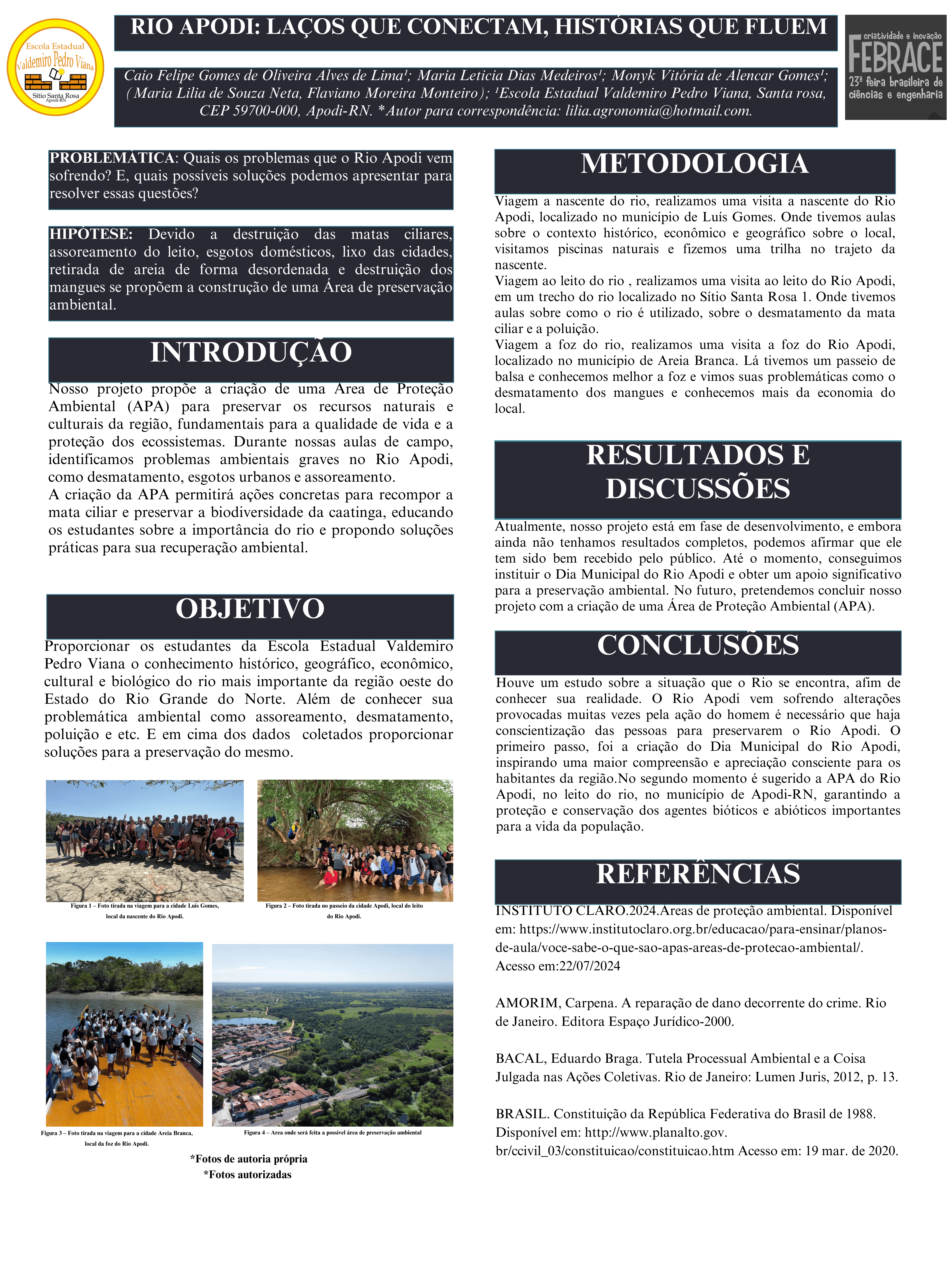 O presente projeto tem como objetivo proporcionar aos estudantes da Escola Estadual Valdemiro Pedro Viana, localizada no Sítio Santa Rosa, zona rural do município de Apodi - RN, um conhecimento aprofundado sobre o Rio Apodi, o rio mais importante da região oeste do Estado do Rio Grande do Norte. Através de uma série de visitas de campo à nascente, leito e foz do rio, os alunos puderam explorar aspectos históricos, geográficos, econômicos, culturais e biológicos relacionados ao rio, além de observar diretamente as problemáticas ambientais, como assoreamento, desmatamento e poluição. Durante as atividades, foi instituído o Dia Municipal do Rio Apodi, como um passo inicial para sensibilizar a população sobre a importância da preservação desse recurso hídrico. O projeto está em fase de desenvolvimento e já conta com apoio significativo da comunidade, tendo como objetivo final a criação de uma Área de Proteção Ambiental (APA) no leito do rio, no município de Apodi - RN, garantindo a proteção e conservação dos elementos bióticos e abióticos essenciais para a vida da população local.