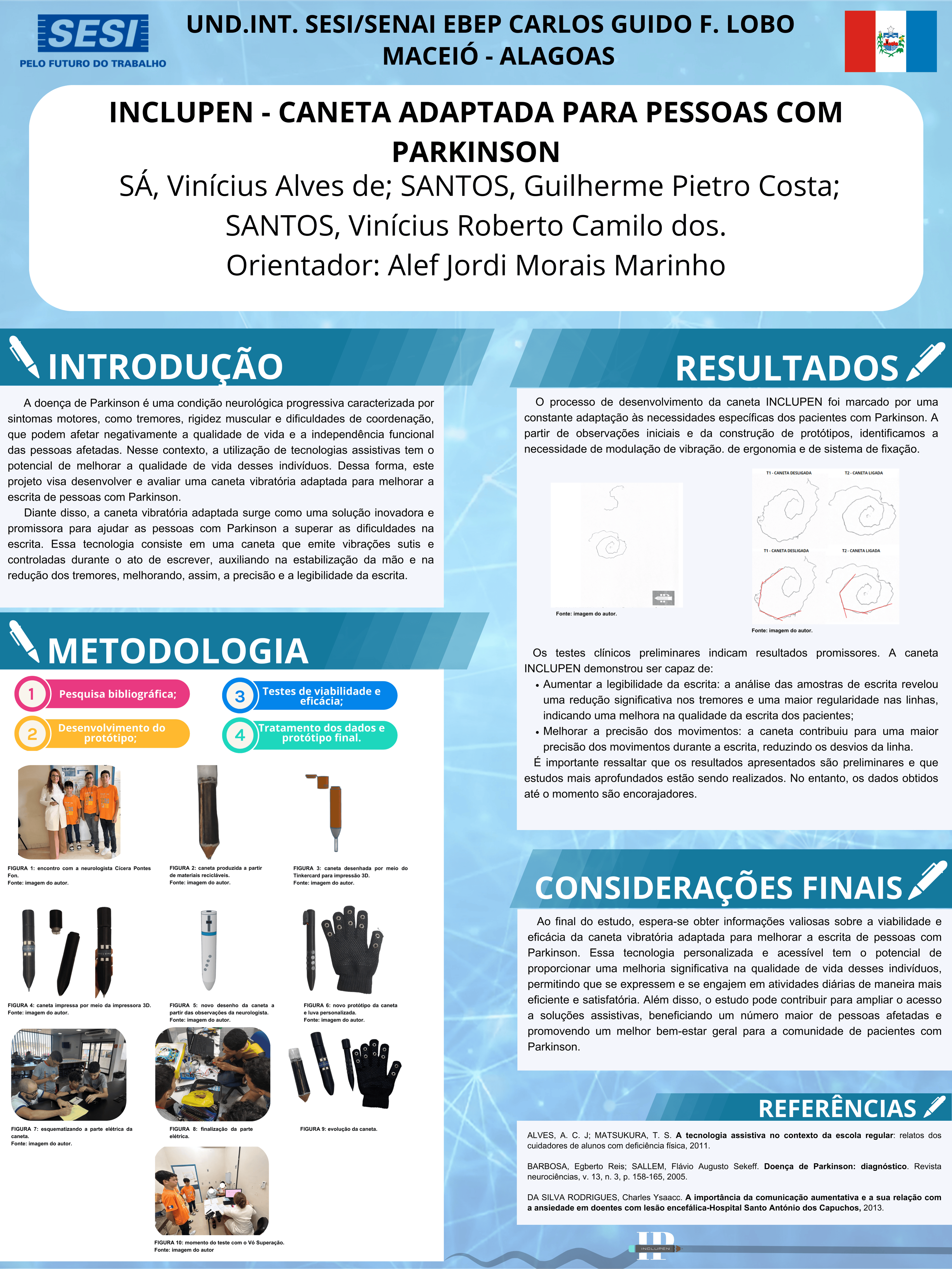 A doença de Parkinson é uma condição neurológica progressiva, caracterizada por sintomas motores como tremores, rigidez muscular e dificuldades de coordenação, que podem impactar negativamente a qualidade de vida e a independência funcional das pessoas afetadas. Nesse contexto, o uso de tecnologias assistivas tem o potencial de melhorar significativamente a vida desses indivíduos. Este projeto, portanto, busca desenvolver uma caneta vibratória adaptada para facilitar a escrita de pessoas com Parkinson. A tecnologia consiste em um dispositivo que emite vibrações sutis e controladas durante o ato de escrever, ajudando a estabilizar a mão e a reduzir os tremores, melhorando a precisão e a legibilidade da escrita. Após o desenvolvimento do protótipo, foi realizado um estudo piloto para testar sua viabilidade e eficácia. Participaram do estudo indivíduos diagnosticados com Parkinson e que apresentam dificuldades na escrita, assim como participantes sem essa condição. Os participantes foram instruídos sobre o uso da caneta vibratória e realizaram tarefas de escrita pré-determinadas, tanto antes quanto durante o uso da caneta. Eles foram divididos em três grupos: a) tremores em ação; b) tremores em repouso; c) participantes sem diagnóstico de Parkinson. Foram coletados dados para verificar a legibilidade, velocidade e precisão da escrita, além de informações subjetivas, como percepção de conforto e facilidade de uso. Os resultados indicam que a caneta vibratória adaptada tem o potencial de melhorar significativamente a escrita de pessoas com Parkinson, permitindo que mantenham sua autonomia, expressem suas ideias e participem de atividades sociais e profissionais de maneira mais eficiente e satisfatória. O projeto, ao focar na melhoria da autonomia e qualidade de vida de pessoas com Parkinson, alinha-se diretamente aos Objetivos de Desenvolvimento Sustentável (ODS) das Nações Unidas, em especial ao ODS 3 – Saúde e Bem-estar e ODS 10 – Redução das Desigualdades.