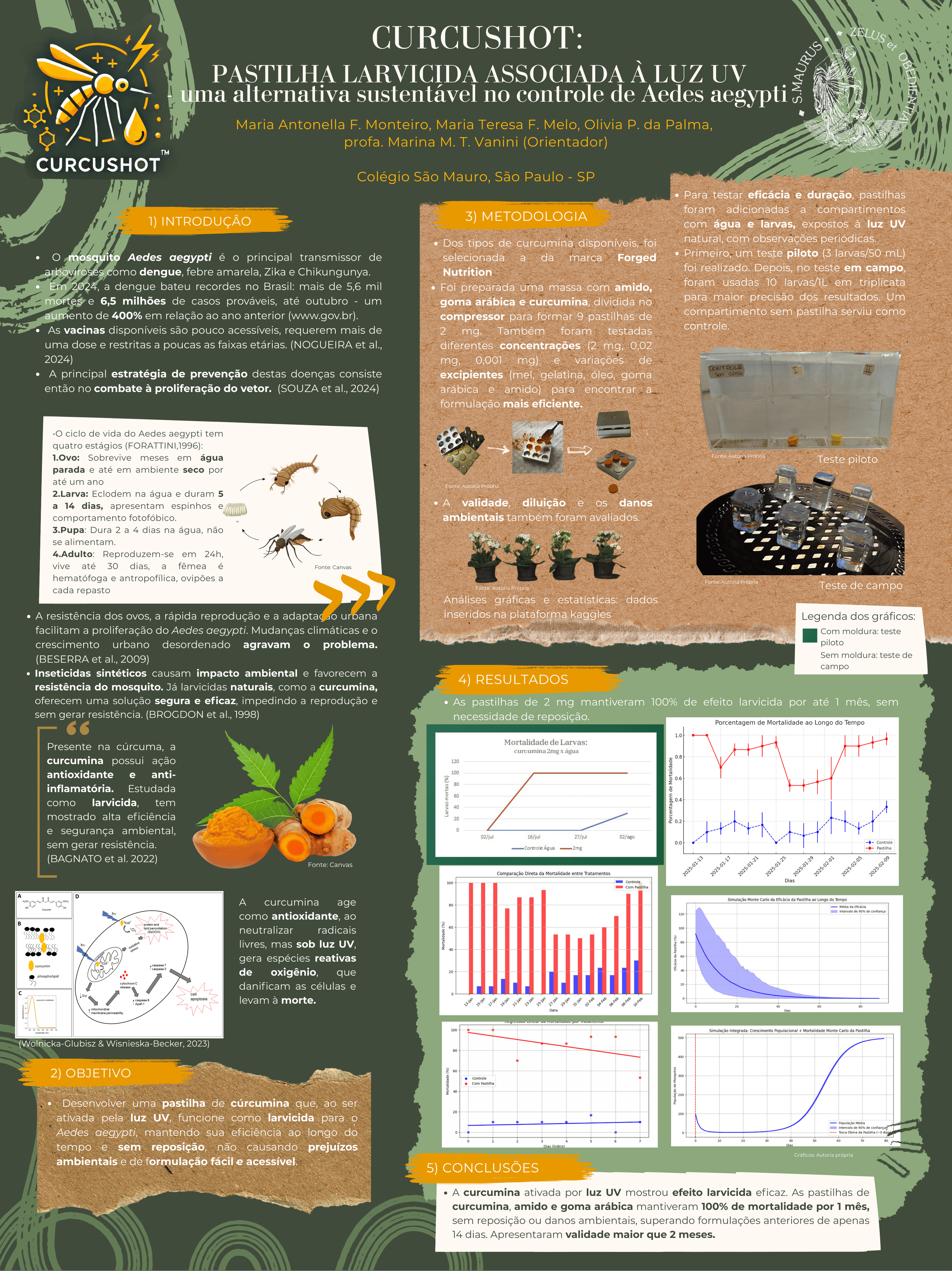 Este projeto foi desenvolvido para explorar uma alternativa natural no controle de larvas do Aedes aegypti, vetor de doenças como dengue, usando pastilhas de curcumina ativadas por luz natural. O objetivo era prolongar a eficácia do composto além das 24 horas, comum nos métodos existentes. Foram testadas diferentes formulações de pastilhas e concentrações de curcumina, expostas à luz natural e UV, e realizadas culturas de larvas para avaliar a mortalidade. Os resultados mostraram que as pastilhas com 2mg de curcumina mantiveram alta eficácia por mais de 30 dias, atingindo mais de 90% de mortalidade. A solução provou ser prática, sustentável e segura para o meio ambiente, atingindo os objetivos propostos.