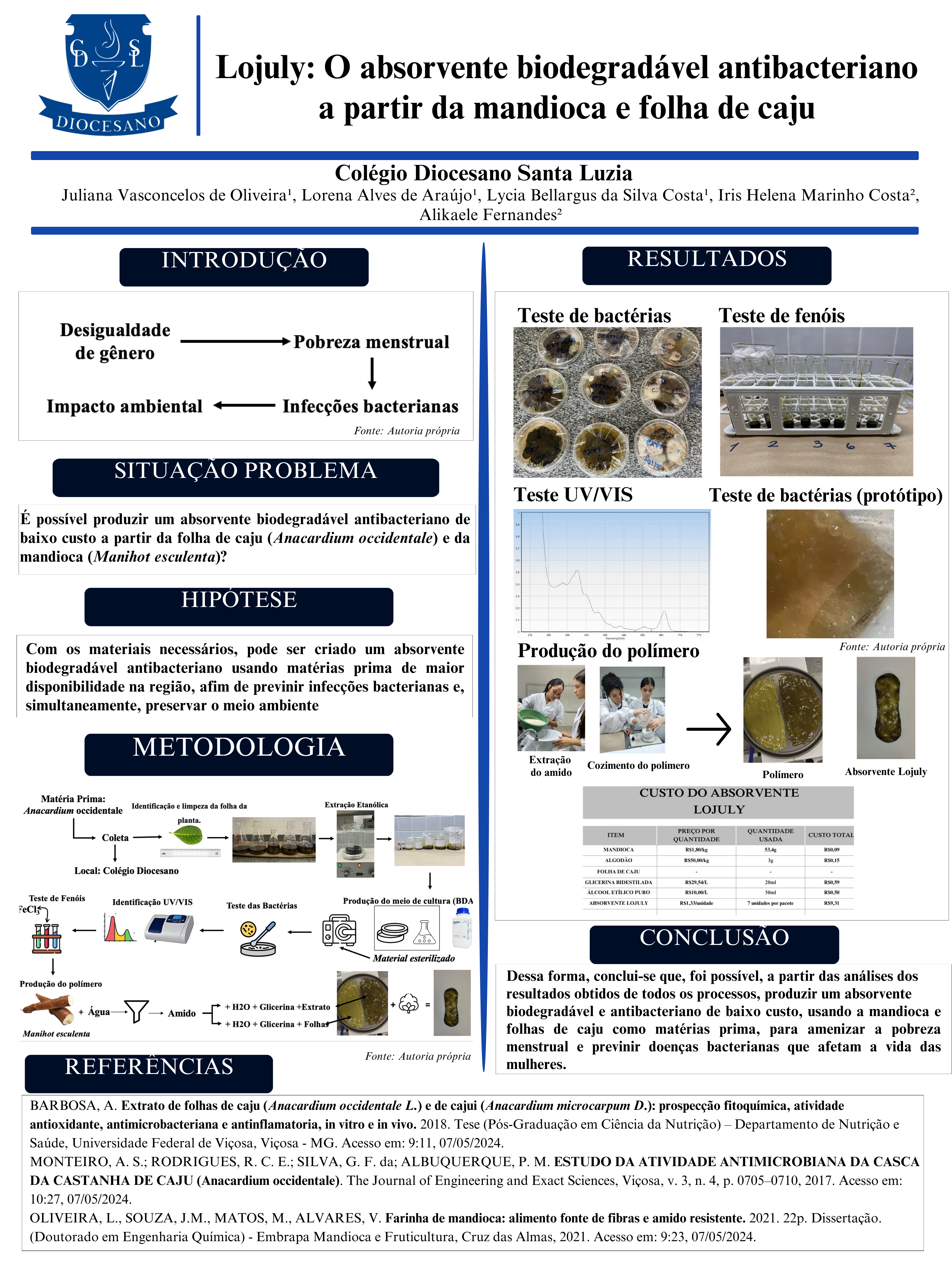 A desigualdade de gênero e a falta de acesso a cuidados básicos de saúde, perseguem milhões de mulheres no Brasil e o índice de pobreza menstrual só aumenta e consequentemente infecções por bactérias. A composição majoritariamente plástica desses absorventes, que não são passíveis de reciclagem, constitui um fator preocupante para o meio ambiente e à saúde pública. Adicionalmente, o uso prolongado e inadequado de absorventes comuns associa-se a um aumento nos casos de infecções bacterianas. Nesse contexto desafiador, a proposta é a criação de um absorvente acessível que não apenas combata a pobreza menstrual, mas também reduza significativamente o impacto ambiental e atue como um agente antibacteriano. Esse absorvente é fabricado a partir de um plástico biodegradável obtido a partir da mandioca (Manihot esculenta), um recurso abundante na região da elaboração do projeto que é o Nordeste, ao qual é adicionada o extrato etanólico da folha de caju (Anacardium occidentale L.), um conhecido fruto da região. O processo de fabricação envolve técnicas cuidadosas, incluindo a secagem em uma estufa natural para prevenir o crescimento de fungos, testes in vitro com culturas de bactérias, extração de agentes antioxidantes da folha de caju, teste UV/VIS, extração do amido de mandioca, a preparação de polímeros e a montagem do próprio protótipo. Assim, o objetivo central desse projeto é acolher as mulheres afetadas pela pobreza menstrual por meio de um absorvente de baixo custo, ao mesmo tempo que enfrenta os desafios ambientais e de saúde relacionados aos absorventes descartáveis convencionais.